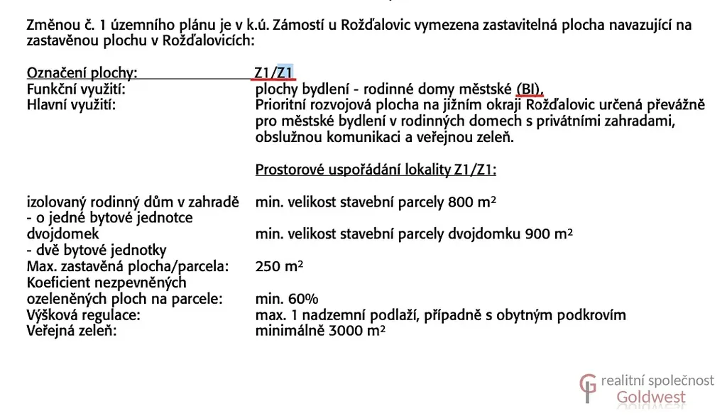 Dle územního plánu je určený k zástavbě a označený Z1/Z1 (BI). - plochy bydlení městské v rodinných domech s privátními zahradami, max. 1 nadzemní podlaží, případně s obytným podkrovím. Zastavěnost pozemku 250 m2, koeficient nezpevněných ozeleněných ploch min. 60%, možnost stavby i dvojdomu na parcelách o min. velikosti 900 m2.