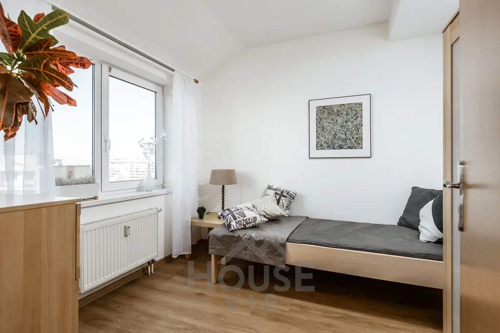 Byt je dispozičně řešen jako dvouúrovňový mezonet, kde po vstupu do předsíně přecházíte do obývacího pokoje, kuchyně a dalšího pokoje. Dominantou bytu je prostorný pokoj cca 26 m² se čtyřmi protilehlými okny, který nabízí bohaté denní světlo a pocit vzdušnosti. Do hlavního pokoje se vstupuje po interiérovém schodišti, které odděluje obytné zóny a přidává bytu charakter mezonetu.