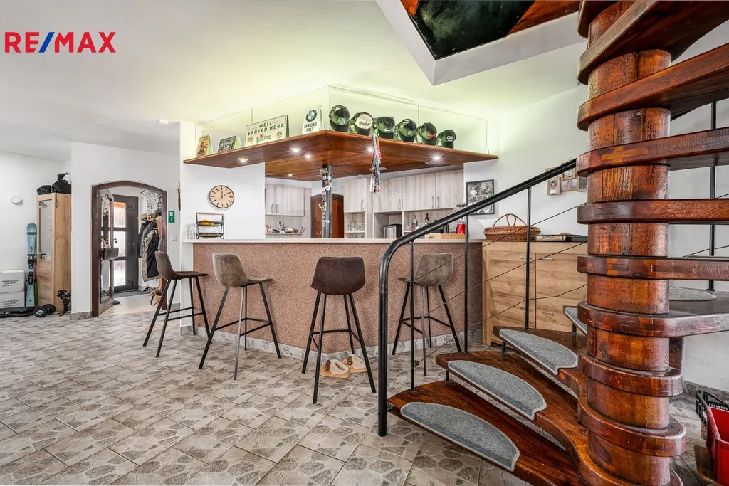 Po vstupu do domu se nachází zádveří, které vede do velké společenské místnosti s barem – ideální prostor pro snídaně, večerní posezení rodiny nebo menší společenské akce.