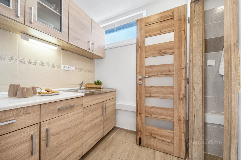 Apartmány sdílí plně vybavenou kuchyň a lze je oddělit uzamykatelnými dveřmi.