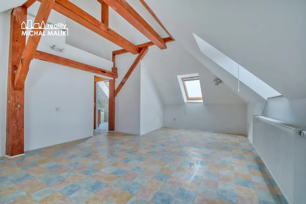 Dominantou bytu je velký otevřený prostor obývacího pokoje s kuchyňským koutem, který působí vzdušně a nabízí dostatek místa pro každodenní život i odpočinek. Z tohoto prostoru je přístup na samostatné WC a zároveň odtud vedou dřevěné schody do horní části bytu, která může sloužit jako ložnice, pracovna nebo relaxační zóna.