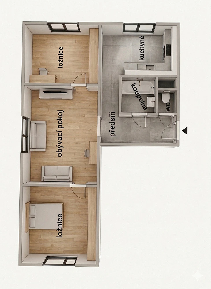 Díky promyšlené dispozici a orientaci na tři světové strany je byt krásně světlý a působí velmi příjemně.