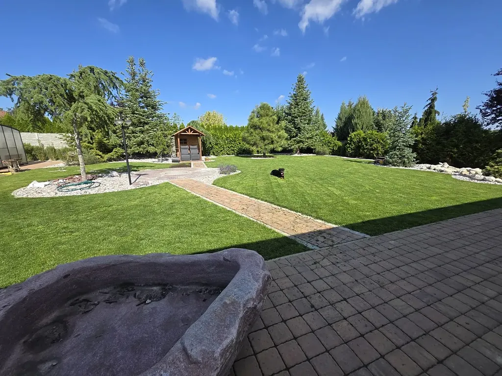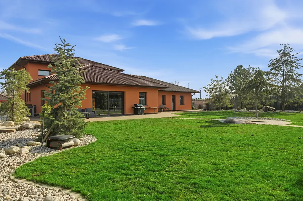 Zahrada tvoří doslova soukromý park se vzrostlými stromy, cedry, borovicemi a designovými solitérními kameny. Nechybí automatická závlaha Hunter, ozvučení Bose napojené na smart systém, inteligentní osvětlení ani robotická sekačka Segway. Celý pozemek je rovinatý, plně využitelný a poskytuje maximální soukromí.