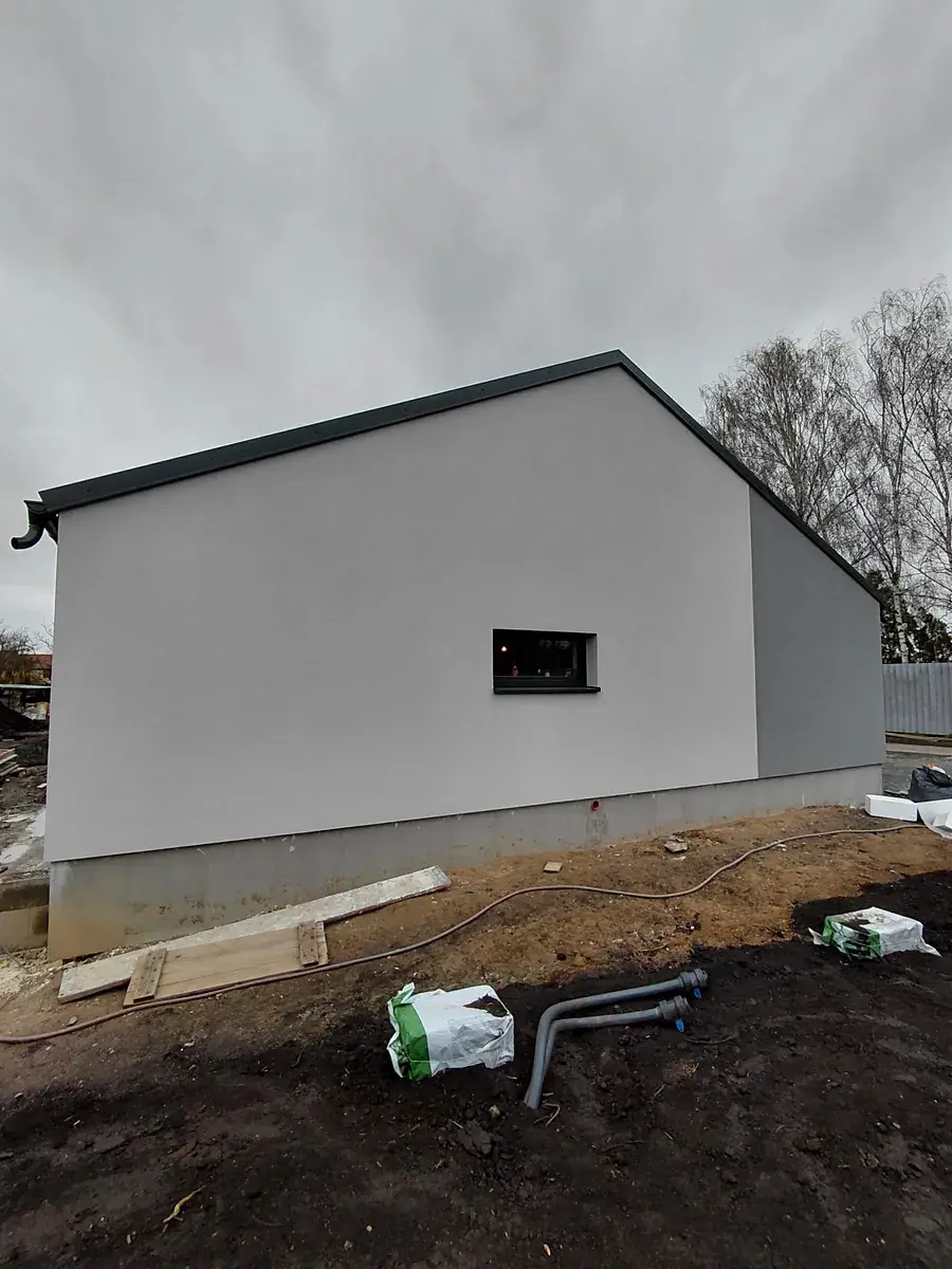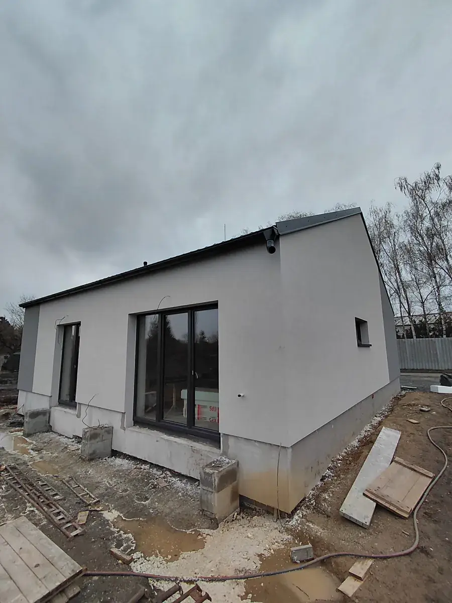 Dům je již dokončen, kromě těchto zmíněných zařizovacích předmětů v interiéru, které umožňují klientovi vybrat si materiály a barvy. Nyní ještě budeme provádět zpevněné plochy kolem domu a zámkové dlažby.