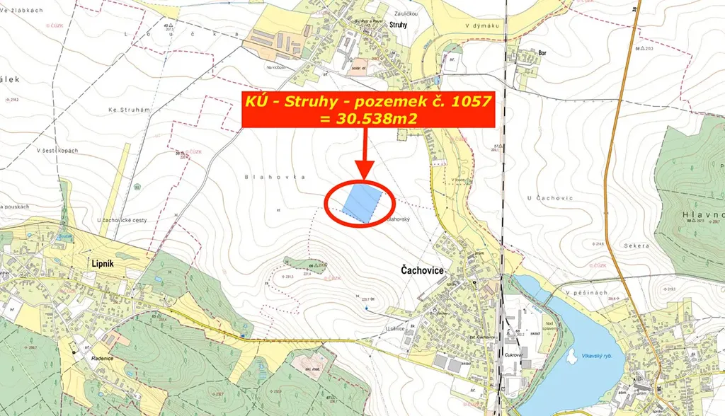 Jedná se o 4 rovinné zemědělské pozemky parc. 579/1, 864, 866, 885 o celkové výměře 34071 m2 s využitím u 3 pozemků jako orná půda s přístupem u pozemku parc. 885 ze silnice Čachovice – Lipník, u pozemků parc. 864, 866 po polích ve vlastnictví jiných osob. Využití pozemku parc. 579/1 je jako louka se zvýšenou hladinou spodní vody způsobenou Vlkavským potokem. Přístup k pozemku je přes pozemek jiného vlastníka.