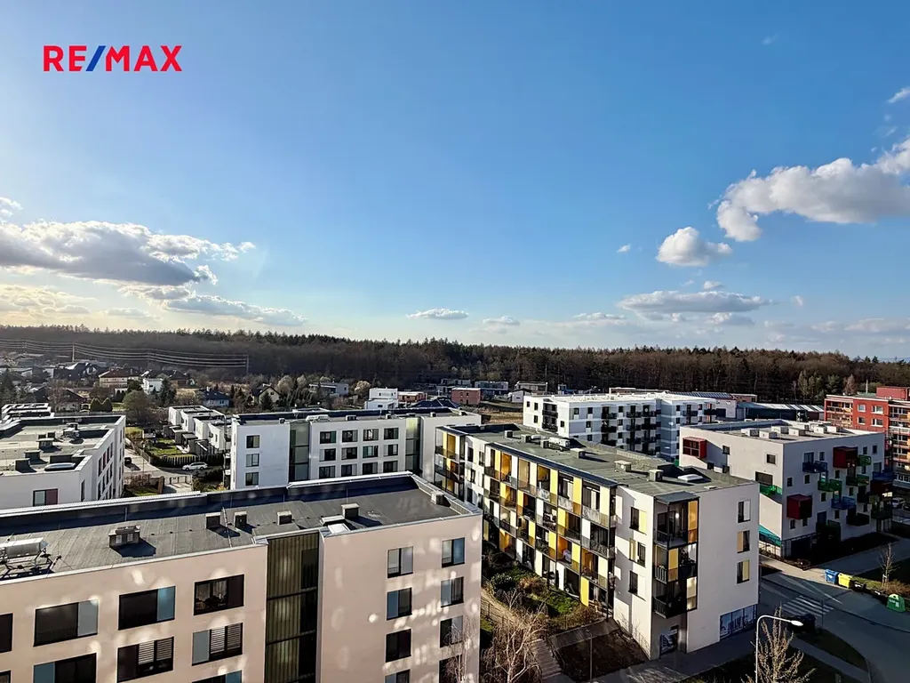 Výhodou je zasklená lodžie s krásným výhledem vysoko nad vilovou čtvrť a v dálce na les.
