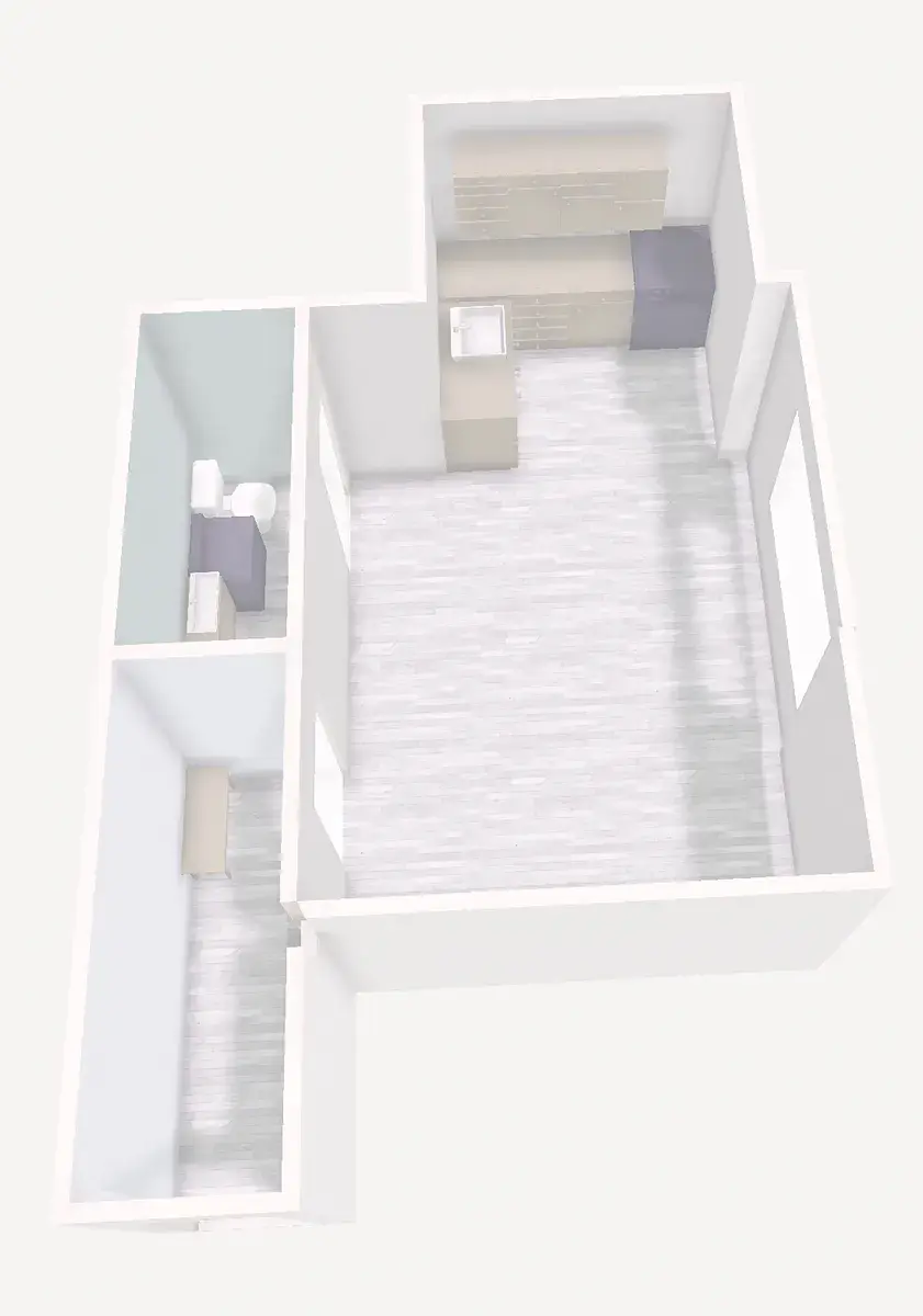 Byt o celkové výměře 26,4 m2 prošel kompletní rekonstrukcí a skládá se ze světlého pokoje s kuchyňským koutem (vybaveno kuchyňskou linkou se sklokeramickou varnou deskou, elektrická trouba, lednice s mrazákem a digestoří). V koupelně se nachází sprchový kout, umyvadlo a pračka a WC. Byt disponuje prostornou předsíní vybavenou botníkem a věšákem.