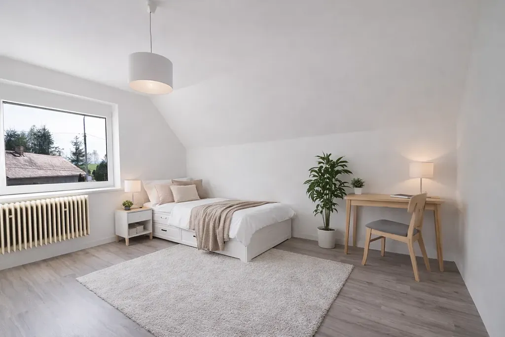 Podkroví nabízí další dva připravené pokoje, které můžete dokončit podle svých potřeb – třeba jako dětské pokoje, kancelář nebo úložné prostory. (Podkroví zatím není napojeno na otopný systém.)