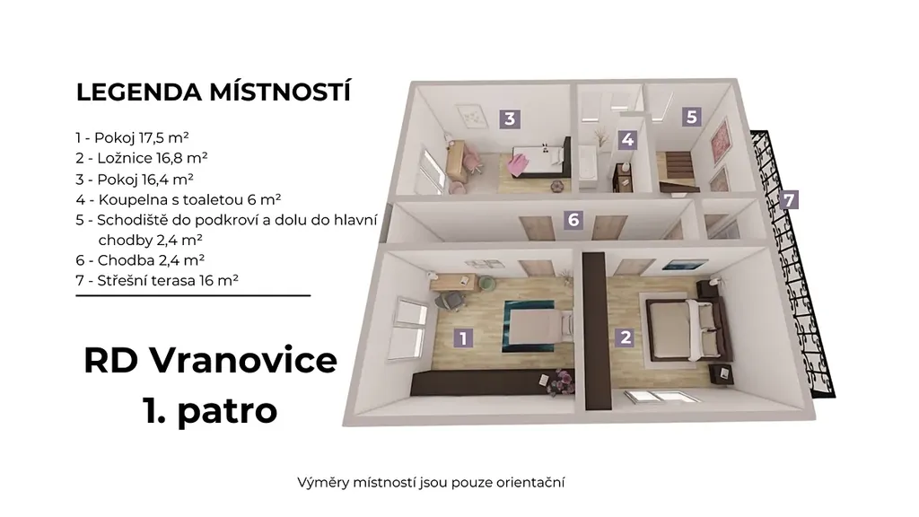 V patře jsou tři prostorné pokoje, druhá koupelna s toaletou a terasa s výhledem do zahrady a okolní přírody – ideální místo na večerní posezení při západu slunce.