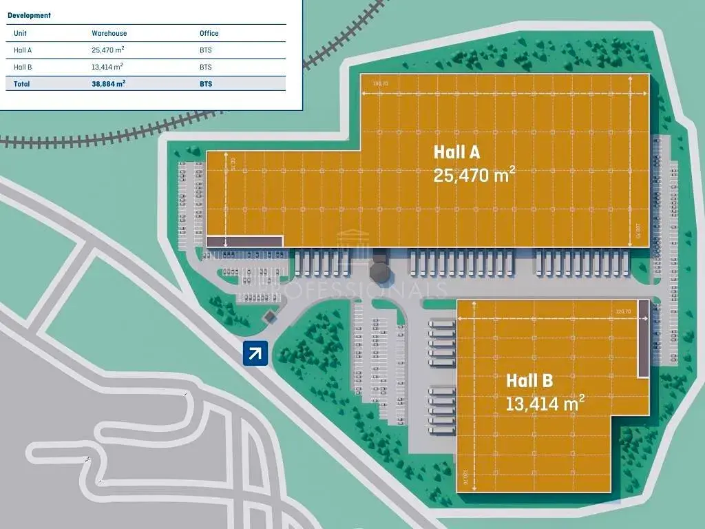 Budovy třídy A+ vhodné pro logistiku a lehkou výrobu. Dvě haly s celkovou plochou 38 900 m² skladových prostor a flexibilními kancelářskými možnostmi. Řešení Build-to-Suit přizpůsobitelná požadavkům nájemce. Světlá výška až 12 m a nosnost podlahy 5 t/m² (bodové zatížení regálu 7 t), 36 nakládacích ramp a 10 vjezdů v úrovni terénu.