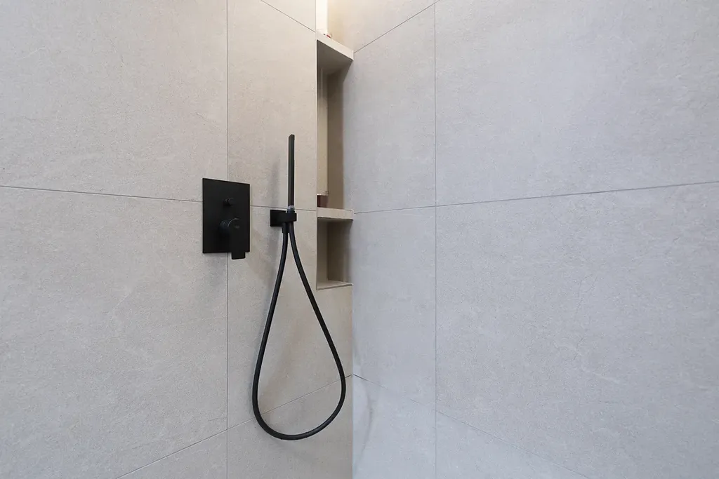 Koupelna je řešena ve vysokém standardu, s důrazem na detail a komfort – dominuje jí nadstandardně velký sprchový kout.