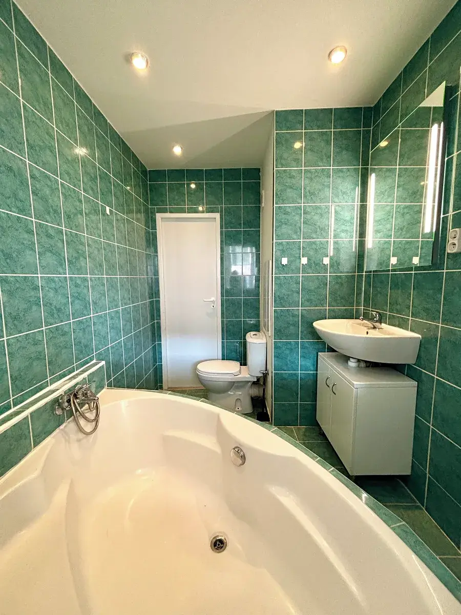 • Prostorná zděnná koupelna s rohovou vanou, WC a skřínky