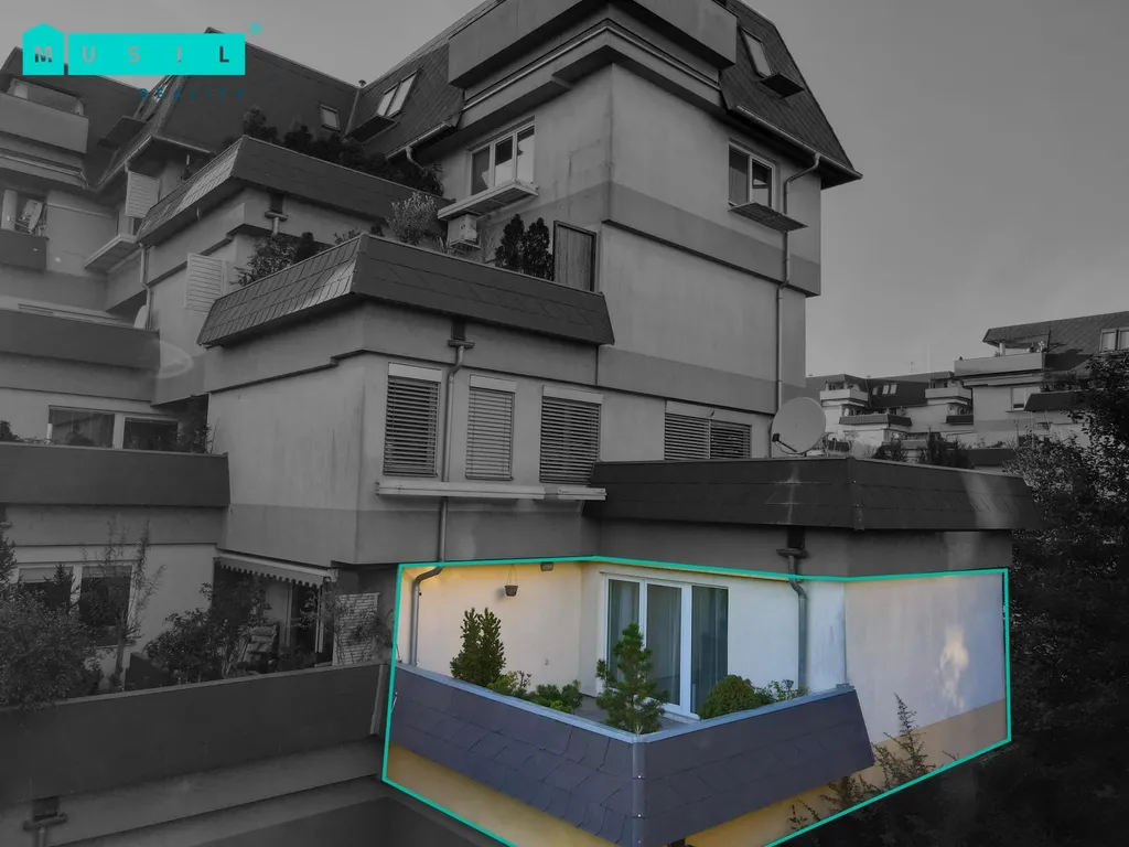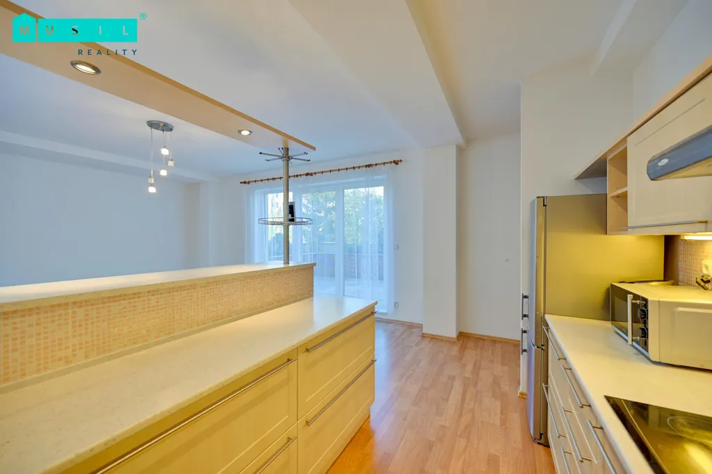 Byt je složen z většího obývacího pokoje s plně vybavenou kuchyňskou linkou v pastelových barvách. Obývací část bytu obohacuje možnost využití útulné terasy, na kterou se vchází francouzským oknem, o výměře 23m2. Propojení interiéru s exteriérem z tohoto prostoru v letních měsících činí nadstandardní centrální bod rodinného bydlení.