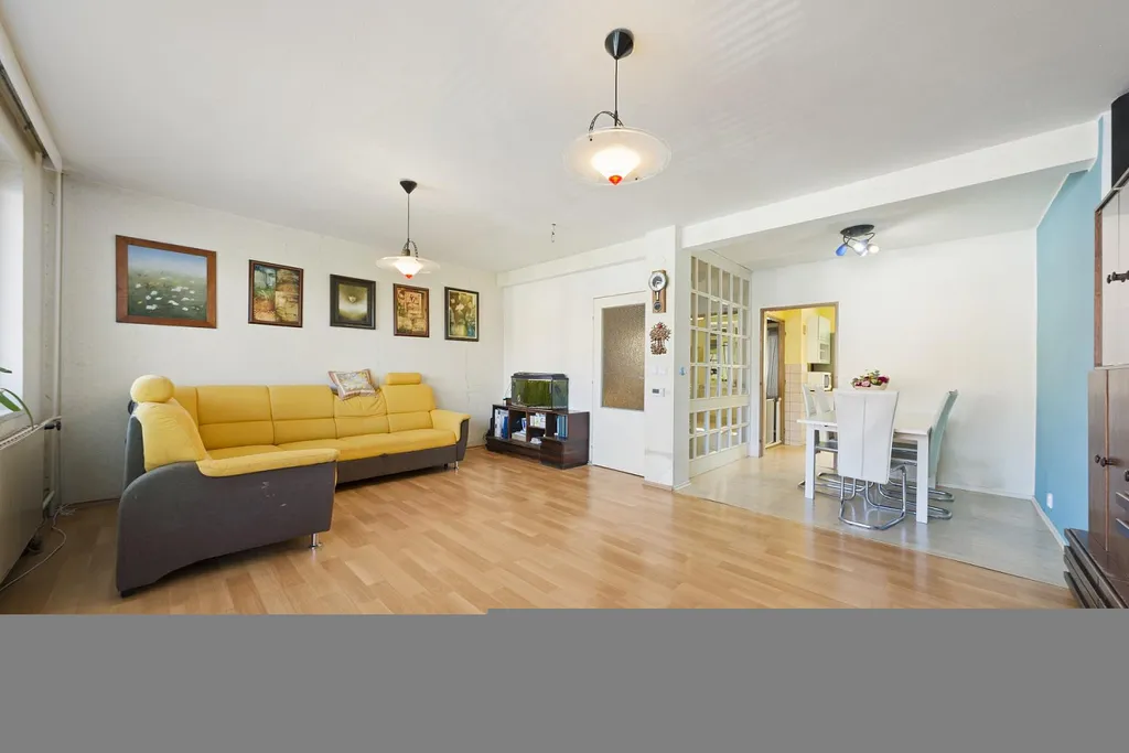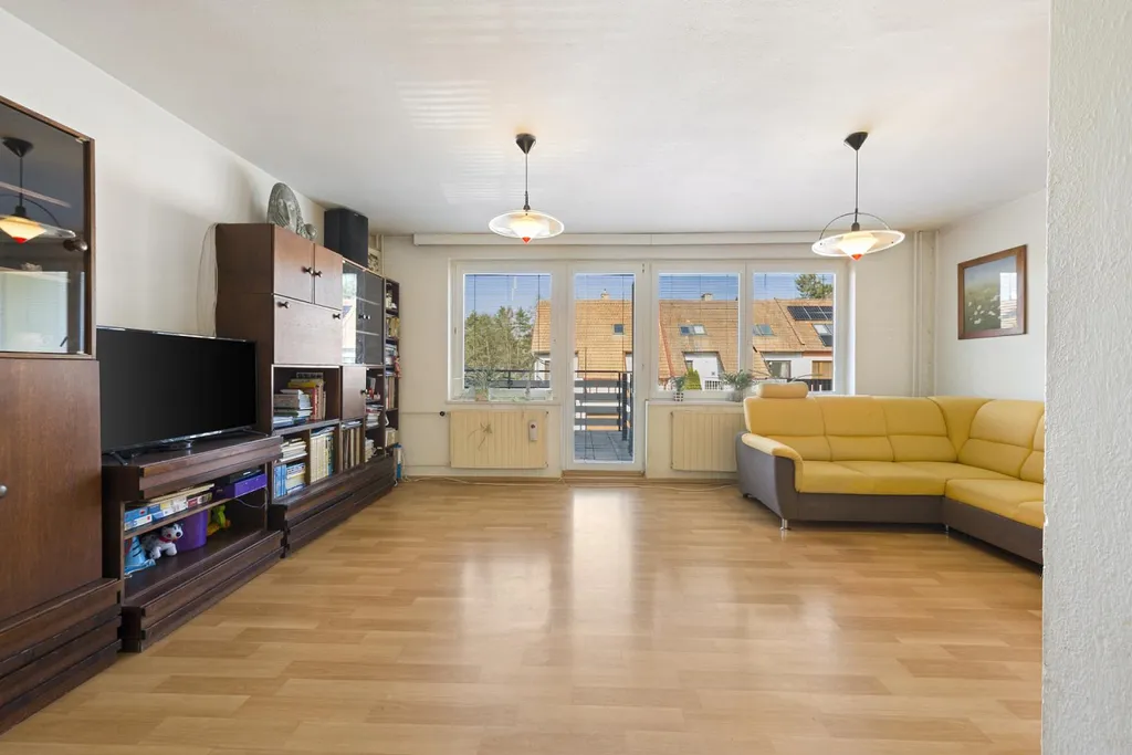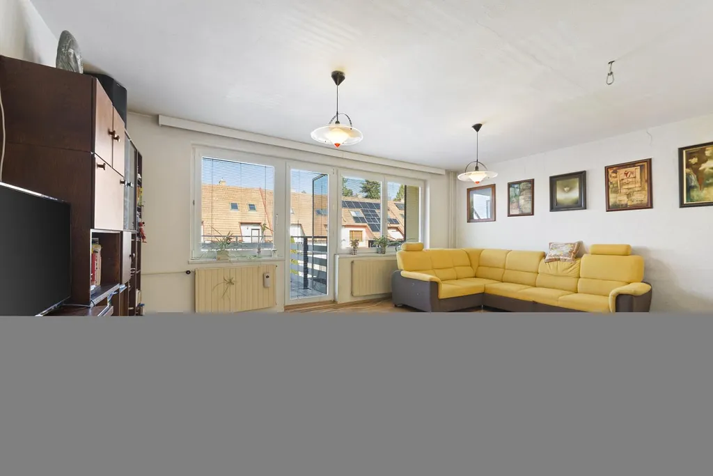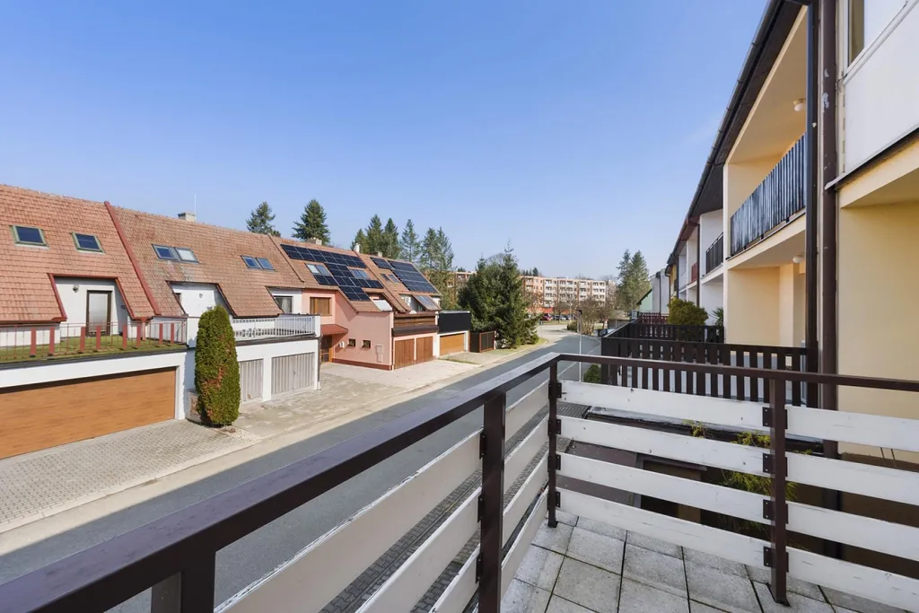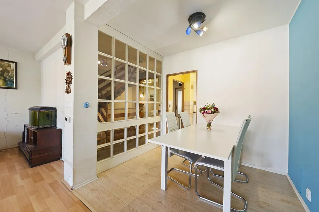 V patře se nachází prostorná kuchyň, jídelna s obývacím pokojem a výstupem na terasu, samostatné WC a přechodová místnost se zasklením a výstupem do zahrady. Poslední patro domu nabízí dva pokoje, z nichž jeden je průchozí, a dvě samostatné ložnice, obě s výstupem na zasklenou lodžii.