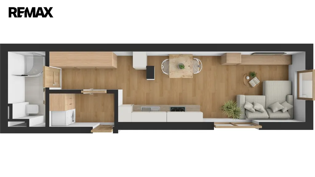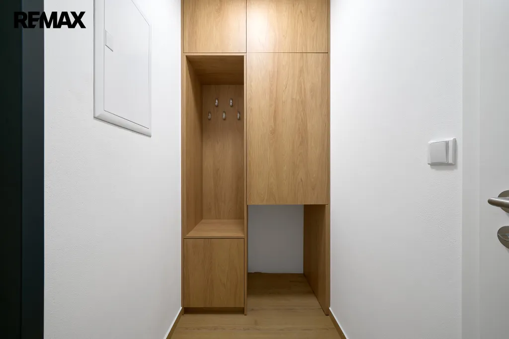 Dispozice bytu je prakticky řešená a nabízí vstupní chodbu se skříní, prostorný a světlý pokoj, kuchyňský kout, koupelnu s WC a sprchovým koutem. Součástí koupelny je také pračka, umyvadlová skříňka a zrcadlová skříňka. Kuchyňská linka je nová a vybavena elektrickou troubou, sklokeramickou varnou deskou, myčkou nádobí a volně stojící lednicí. V chodbě bytu je umístěná skříň.