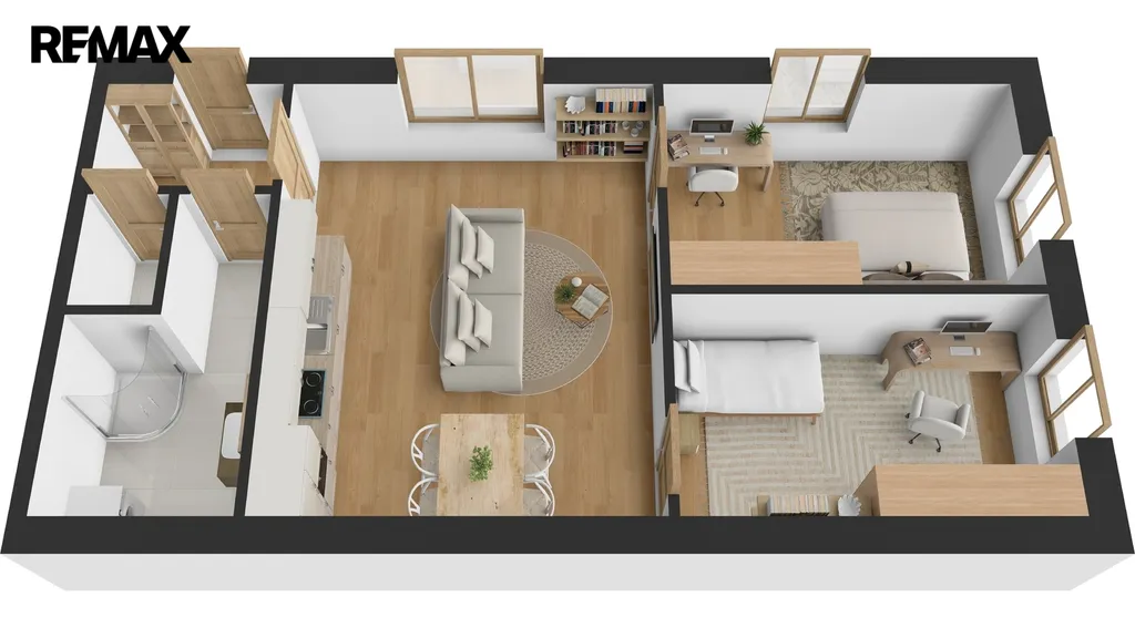 Dispozice bytu je prakticky řešená a nabízí vstupní chodbu, dva samostatné pokoje vhodné jako ložnice, obývací pokoj s kuchyňským koutem a prostorem pro jídelnu, samostatnou toaletu a koupelnu se sprchovým koutem. Součástí koupelny je také pračka, zrcadlová skříňka a umyvadlová skříňka. Kuchyňská linka je nová a vybavena elektrickou troubou, sklokeramickou varnou deskou, myčkou nádobí a volně stojící lednicí.