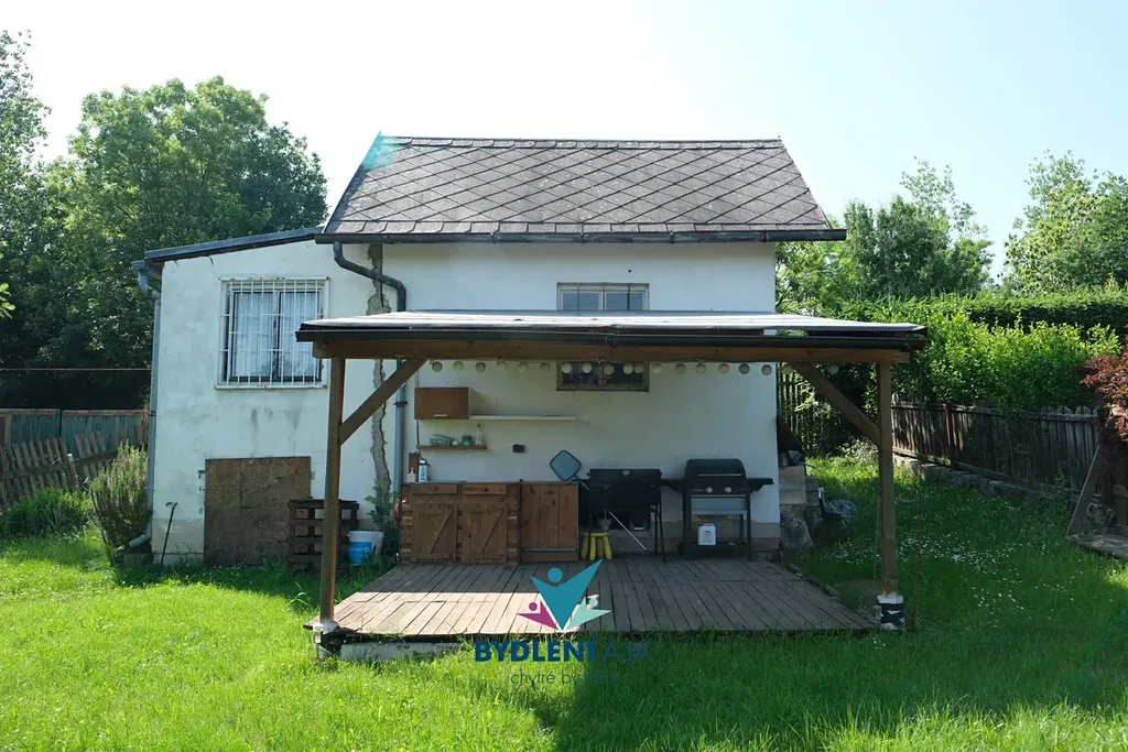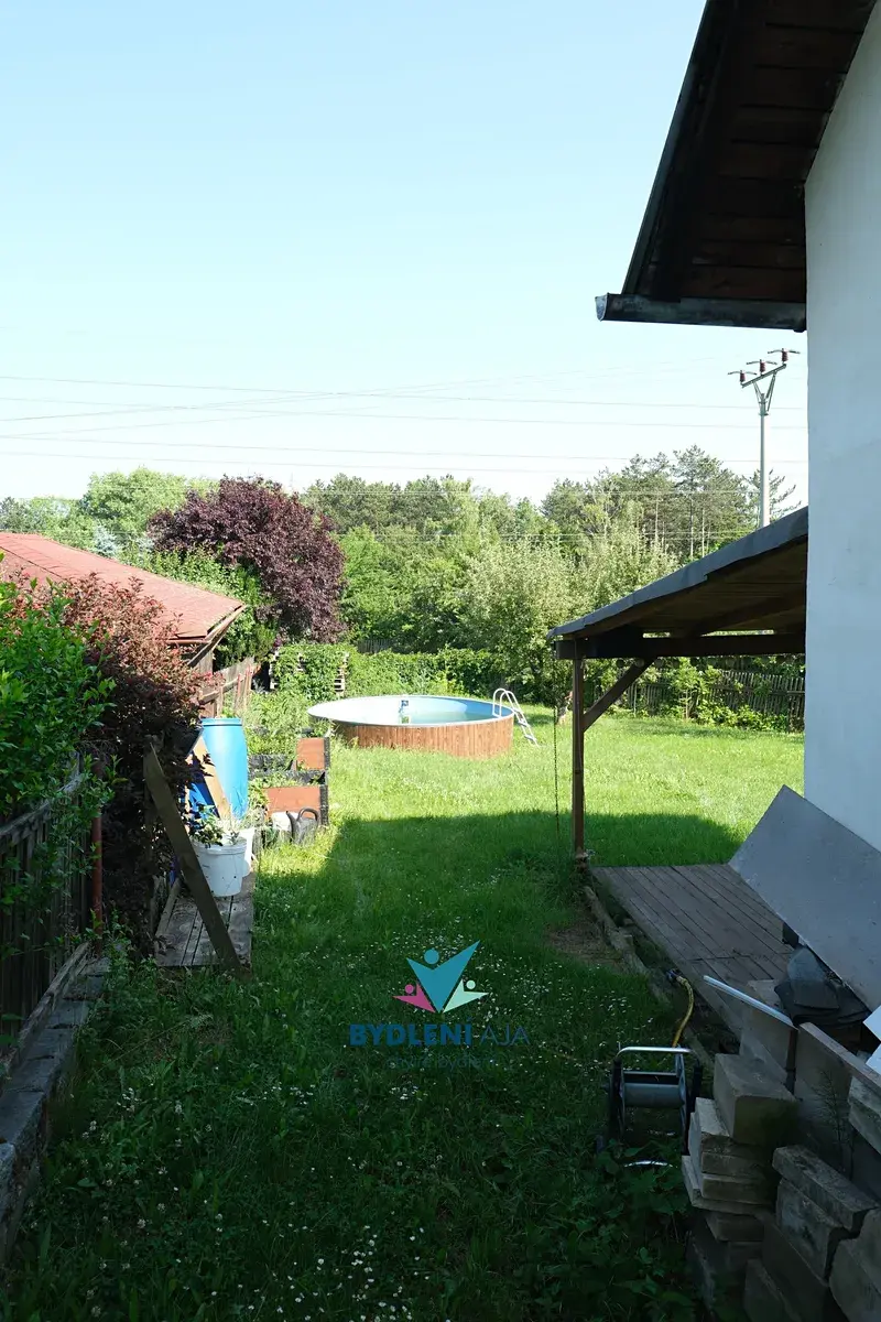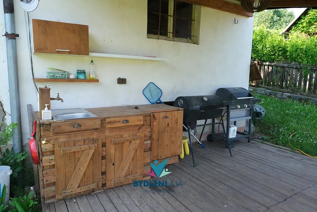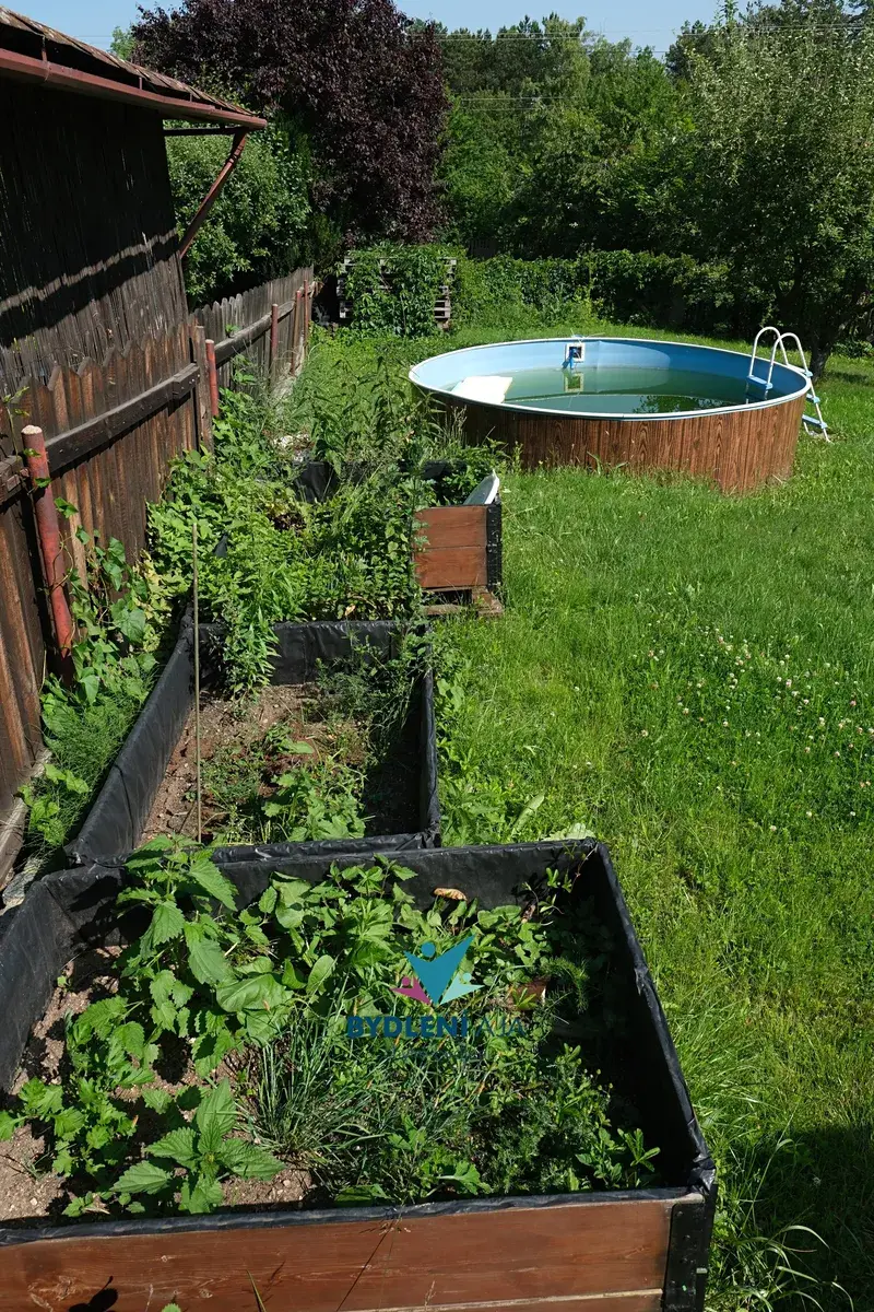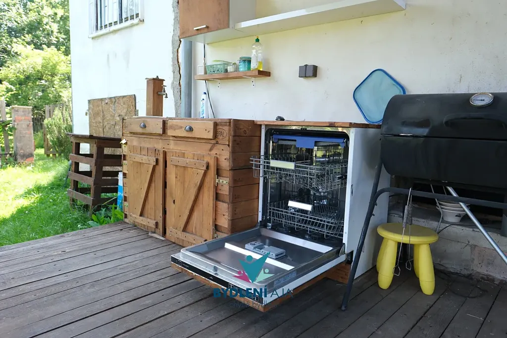 Na udržované zahradě je kromě ovocných stromů, záhonků a květin také bazén pro letní osvěžení a velká zastřešená pergola s výhledem do zeleně. Pergola je vybavena venkovní kuchyní s myčkou nádobí a grilem – ideální pro pohodové chvíle s rodinou nebo přáteli.