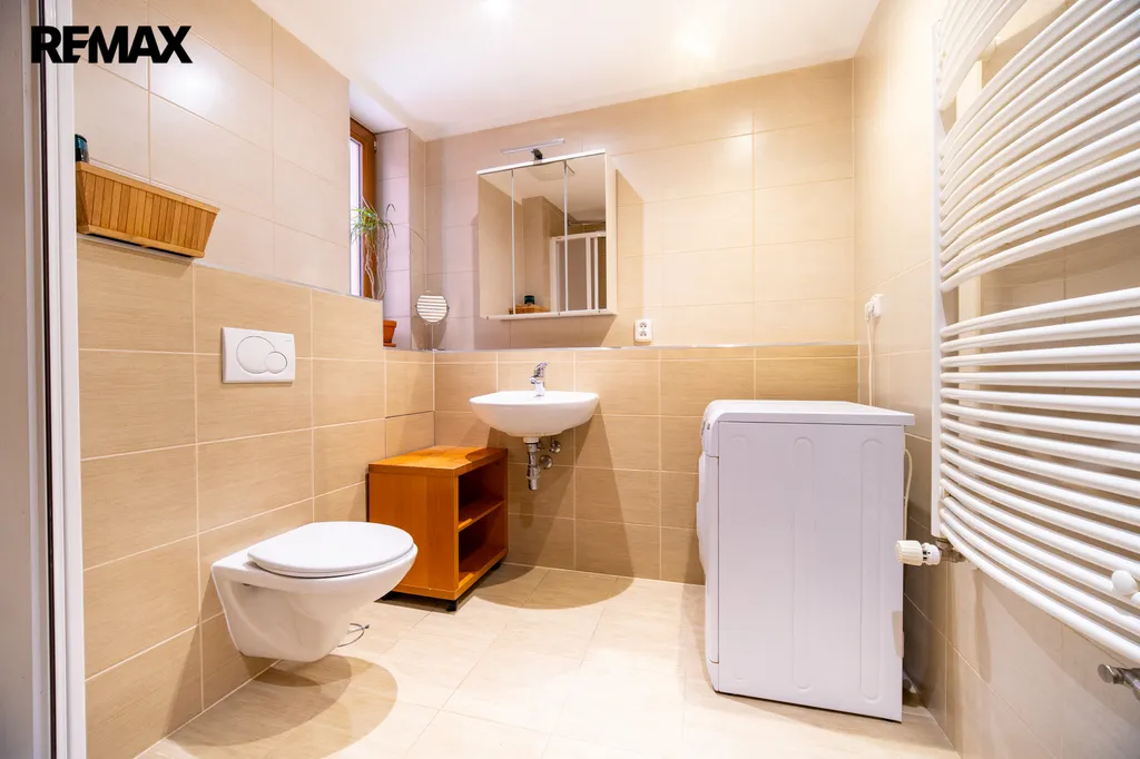 Koupelna je moderně řešena a disponuje sprchovým koutem, pračkou a toaletou.