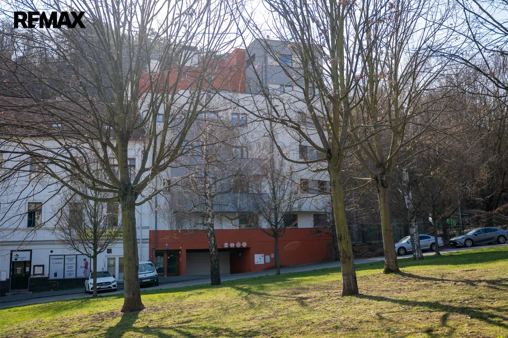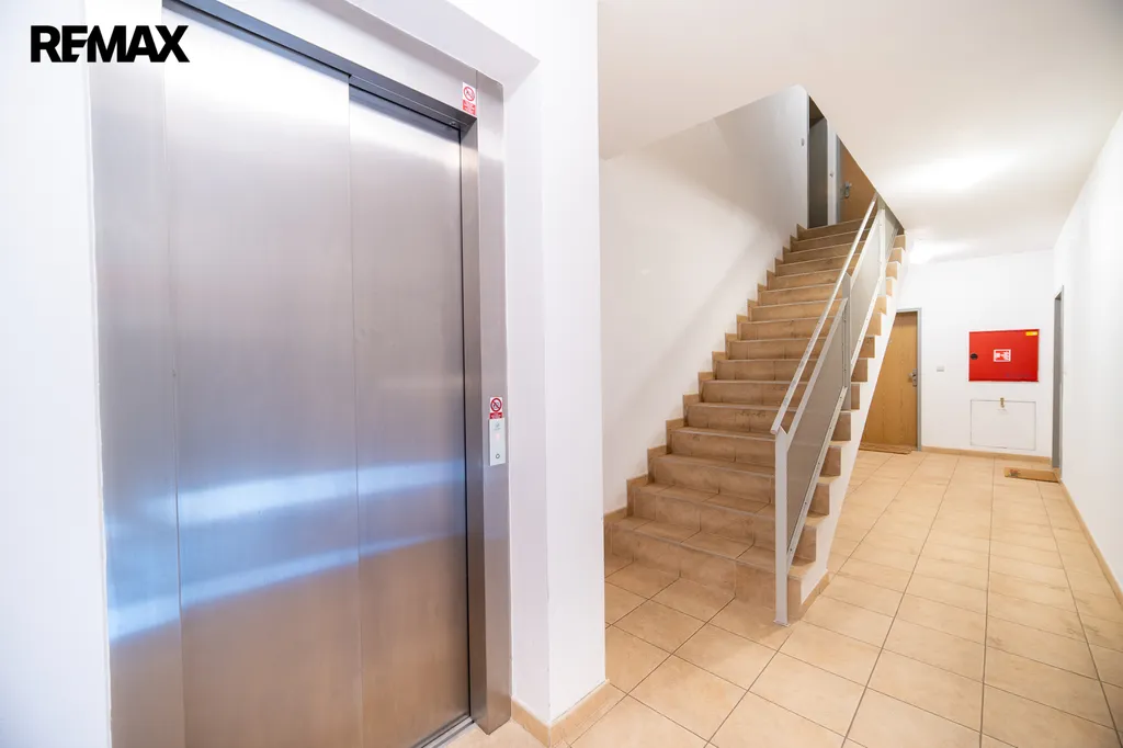 K bytu náleží komfortní garážové stání (22 m²) v podzemní garáži domu. Vjezd je zajištěn přímo z ulice pomocí automobilového (posuvného) výtahu, kterým se pohodlně dostanete do garážového podlaží.