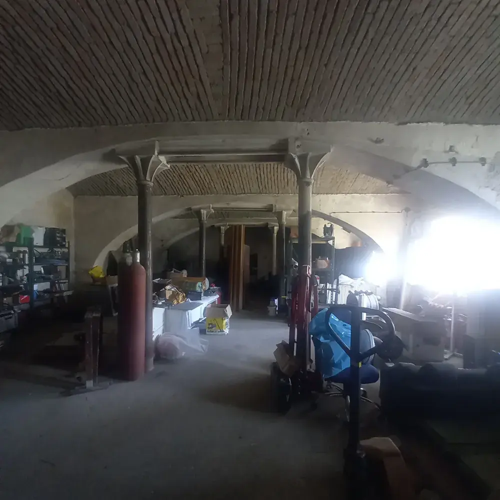 Druhá budova - Přízemí budovy je v zachovalém stavu s historickými ozdobnými kovovými sloupy se třemi klenbami. Světlá výška přízemí je 4 m. Zastavěná plocha je 211 m2. Stavba je kombinace cihly a kamene.