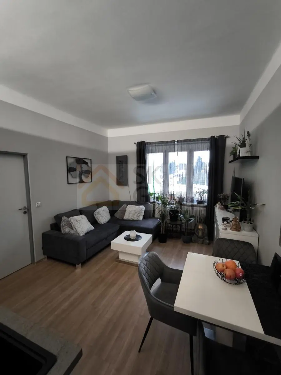 Dispozice bytu: vstupní chodba, obývací pokoj s moderní kuchyňskou linkou, vybavenou indukční varnou deskou, troubou, digestoří a myčkou. Z obývací části je vstup do samostatného pokoje, který aktuálně slouží jako ložnice a pracovna. Koupelna s WC se nachází hned u vstupu do bytu.