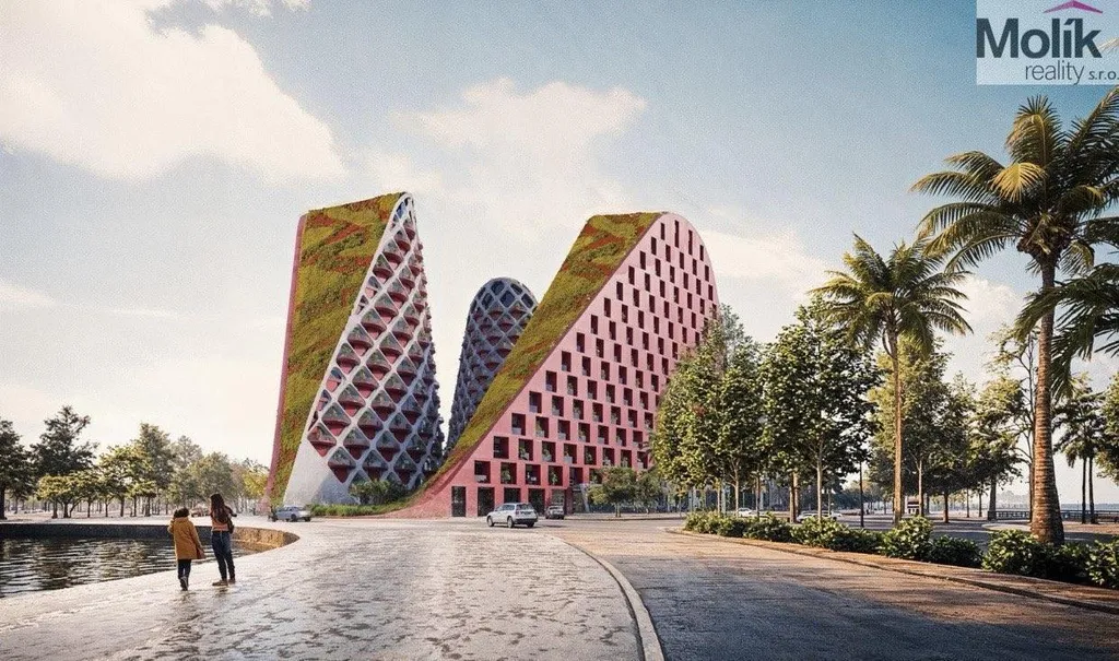 Výšková dominanta: Moderní 16patrová budova s unikátní fasádou pokrytou bujnou vegetací.