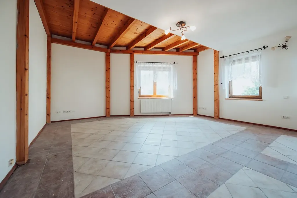 • 1. NP: prostorná kuchyně s jídelnou (57 m²), 2 koupelny, WC, vstupní hala, vnitřní bazén (40 m²) a sauna