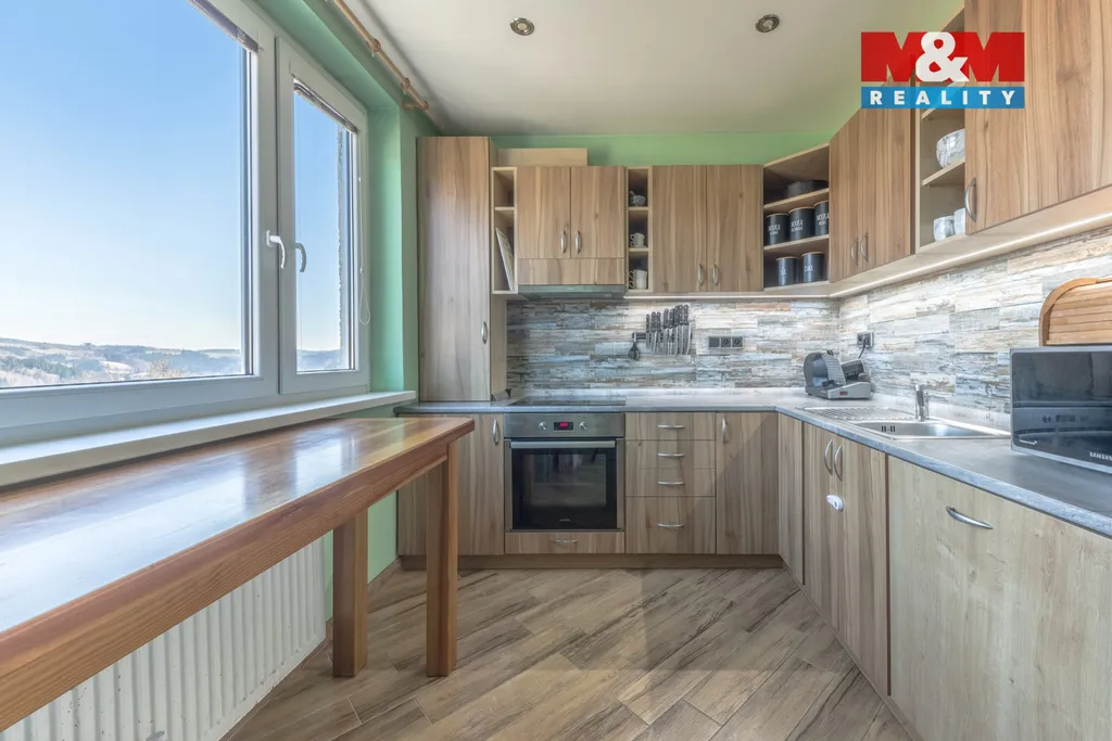 Nabízíme k prodeji krásný byt 2+1 ve Velkých Hamrech. Byt se nachází v posledním poschodí nejkrajnějšího vchodu místního sídliště a nabízí tak naprostý klid a překrásné výhledy do krajiny. Náleží k němu zasklená lodžie, komora, dřevěná sklepní koje ve sklepě a společné prostory jako je kočárkárna, kolárna. Byt prošel rozsáhlou rekonstrukcí, vestavná kuchyně a skříně jsou součástí prodeje, zbytek po domluvě s majitelem. Dům byl revitalizován a díky úplně nové vlastní plynové kotelně jsou velmi nízké náklady na bydlení. Střecha byla nově dělána minulý rok. Vhodné k trvalému bydlení, ale i k rekreaci jako horský apartmán, mnoho ski areálů v těsné blízkosti. Hledáte byt, který je klidný, ihned k nastěhování, nabízí úchvatné výhledy na místní kopce a s nízkými náklady na bydlení? Tak neváhejte a domluvte si prohlídku této výjimečné nabídky.