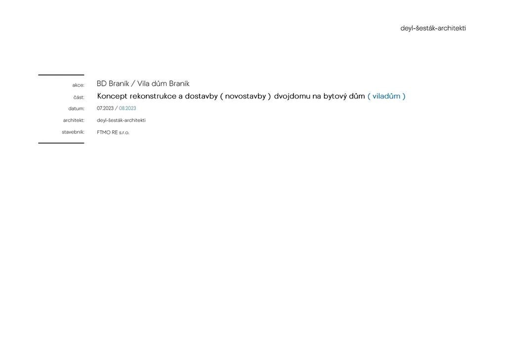 Nabízíme k prodeji kompletní rodinný dvojdům v atraktivní a klidné rezidenční části Prahy – Braníka. Lokalita je dlouhodobě vyhledávaná pro svůj rezidenční charakter, množství zeleně, blízkost Vltavy a volnočasových aktivit, a zároveň dobrou dostupnost do centra Prahy.