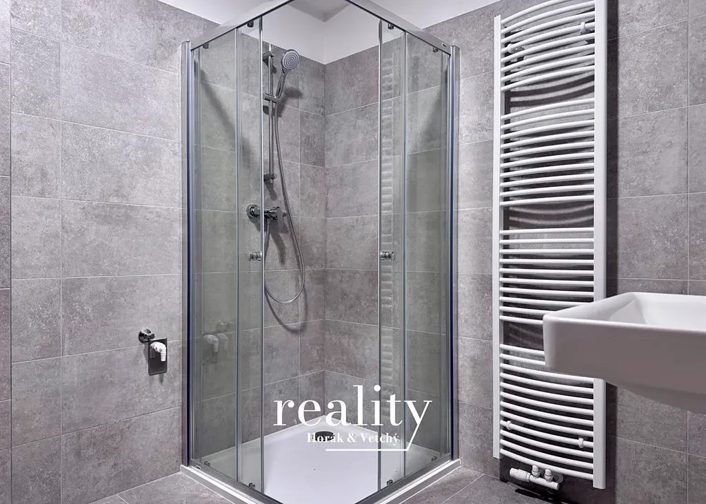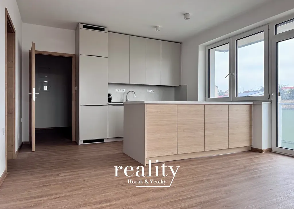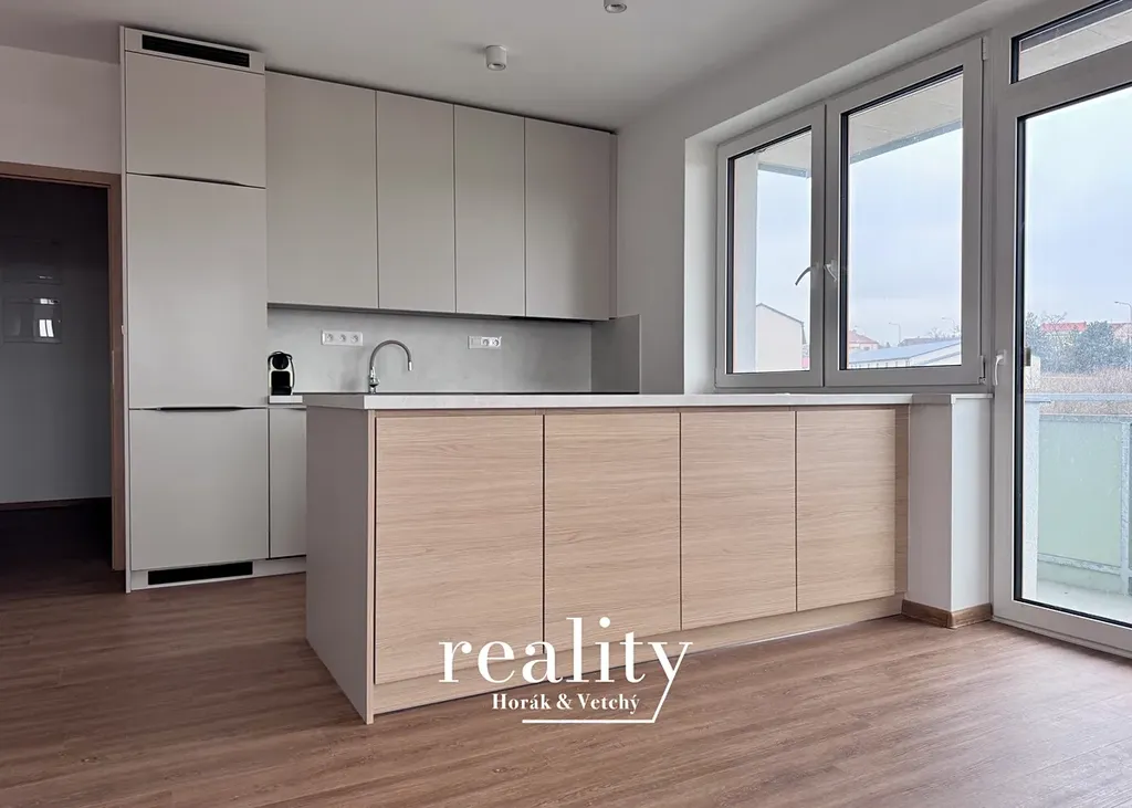 Byt je vybaven moderní kuchyňskou linkou s vestavěnými spotřebiči – lednicí s mrazákem, myčkou a dominantním kuchyňským ostrůvkem, který nabízí velké množství úložného prostoru a zároveň přirozeně propojuje kuchyň s obytnou částí.