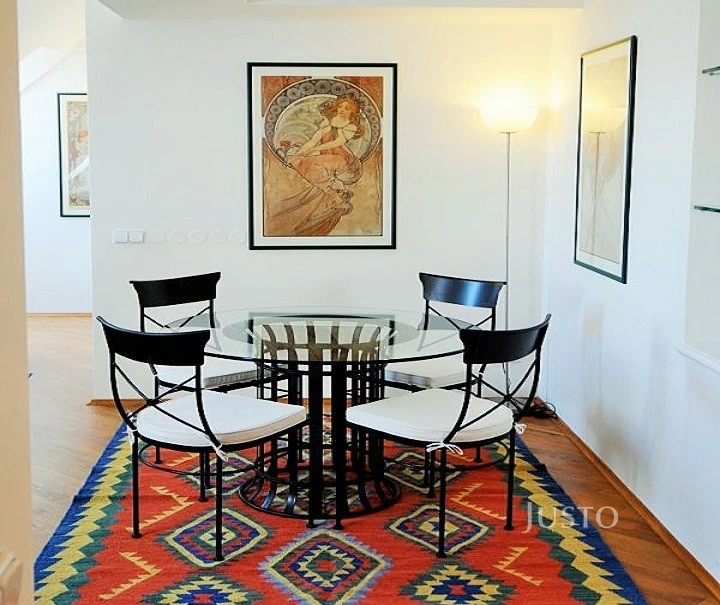 V zastoupení majitele nabízíme k pronájmu plně vybavený dvoupodlažní byt 3+1 v posledním a předposledním patře s výtahem o výměře 108 m² v secesním domě v Praze 2 – Nové Město.