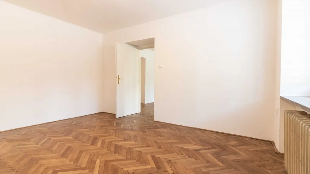 Byt je starší, ale zachovalý, je v přízemí. Pokoje jsou orientované do ulice a kuchyně do vnitrobloku. Vstupní chodba je prostorná s vestavěnými skříněmi. Koupelna je vybavená pračkou, umyvadlem zrcadlem a vanou. WC je odděleně. V kuchyni je ze spotřebičů pouze sporák s troubou a lednice (po dohodě s majitelem se dá odvést, kdyby měl někdo vlastní). Pokoje jsou průchozí, na podlaze jsou dřevěné parkety. V bytě je přípojka na tv i internet.