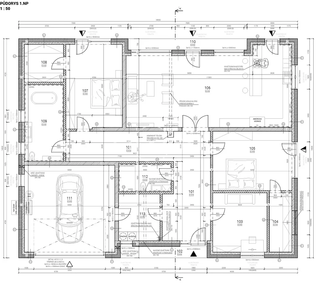 Dispozice domu je 5+kk, o celkové bytové ploše 194,8 m² a garáží pro dva vozy o velikosti 34,5 m². Hlavní společenská zóna je tvořena kuchyňským koutem, jídelní sekcí a obývacím prostorem (54,2 m²). Domem prochází příjemná světlá chodba (34,2 m²), která umožňuje samostatné vstupy do ložnice majitele (20,8 m²) se šatnou (6,5 m²) a přilehlou koupelnou s vanou a toaletou (13,3 m²), do pokoje (20,6 m²) se šatnou (5,9 m²), do druhé koupelny s toaletou a sprchou (6,5m²), dále do pokoje (14,1 m²) a pracovny/komory (8,5m²), jež propojuje obytnou část s garáží.