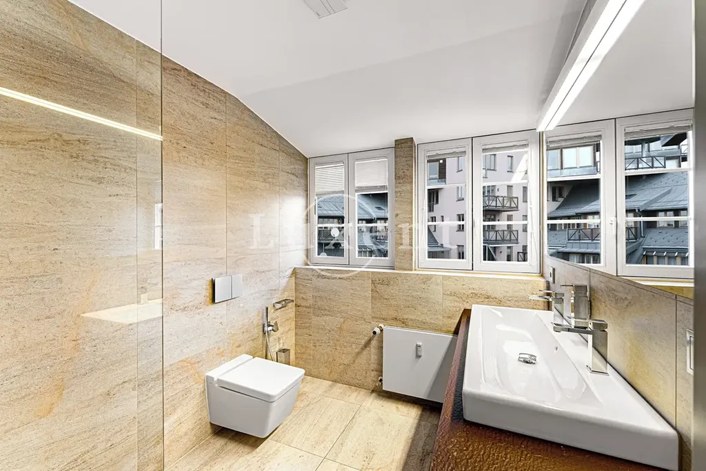 Nabízíme k pronájmu designový mezonetový byt o ploše 120 m² plus terasy (12 m² a 4 m²) v obou úrovních bytu. Nemovitost se nachází v žádané lokalitě Prahy 6 na Veleslavíně v nejvyšších patrech domu s výtahem (6. a 7. NP) . Byt je slunný, s jižní orientací a krásnými výhledy na oboru Hvězda. Je součástí originálního areálu Hvězda od architekta V. Miluniče. V domě jsou podzemní garáže a k bytu v nich náleží 2 parkovací stání (v ceně pronájmu). Metro Petřiny je vzdáleno minuty chůze.