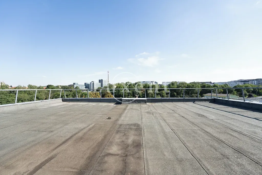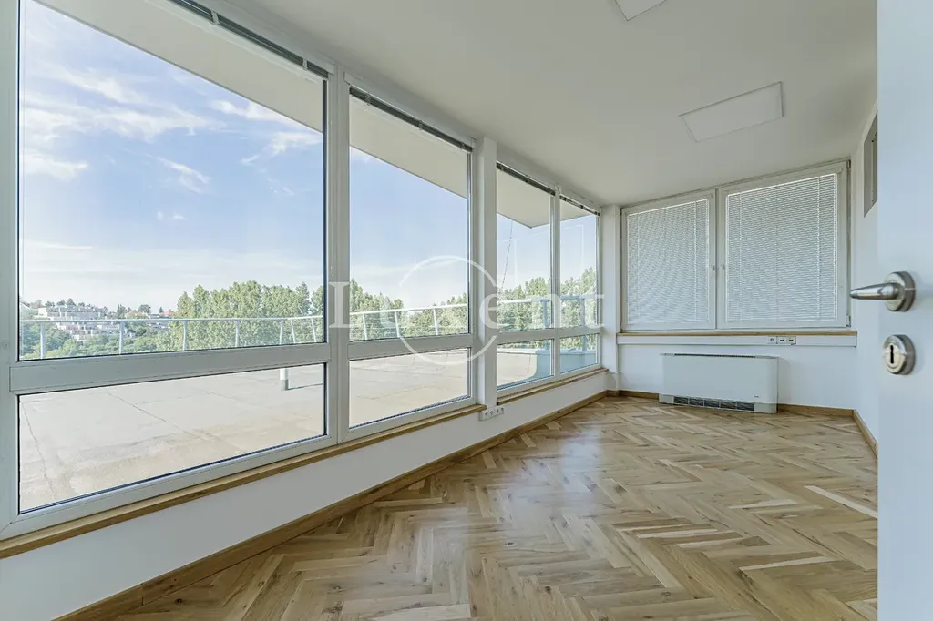 Kancelář se nachází v 5NP budovy s krásným výhledem do okolí, má terasu. Prostor skládá se z hlavního otevřeného prostoru 4 menších kanceláří oddělených skleněnými příčkami.