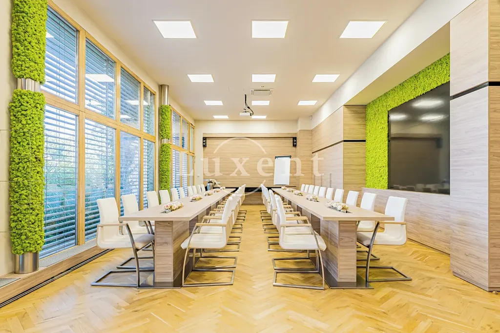 Budova má rovněž k dispozici dvě zasedací místnosti. V objektu nalezneme také zrekonstruovanou restauraci s letní zahrádkou. Parkovací stání v areálu je za poplatek. Možnost převodu sídla firmy.