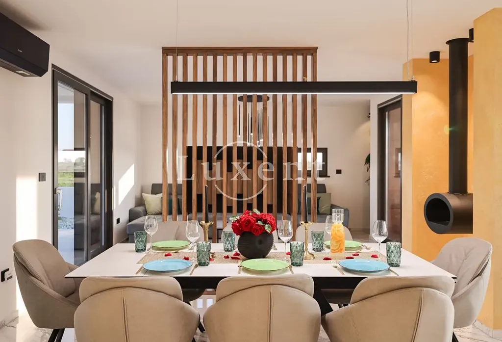 Tato designově zařízená vila má čtyři ložnice, z nichž tři se nachází v horním patře nemovitosti a jedna v přízemí. Každá ložnice disponuje vlastní koupelnou. Dále je zde samostatná koupelna, obývací pokoj propojený s kompletně vybavenou kuchyní a jídelnou se vstupem na dolní terasu. Z horní terasy v prvním patře se můžete kochat výhledem na