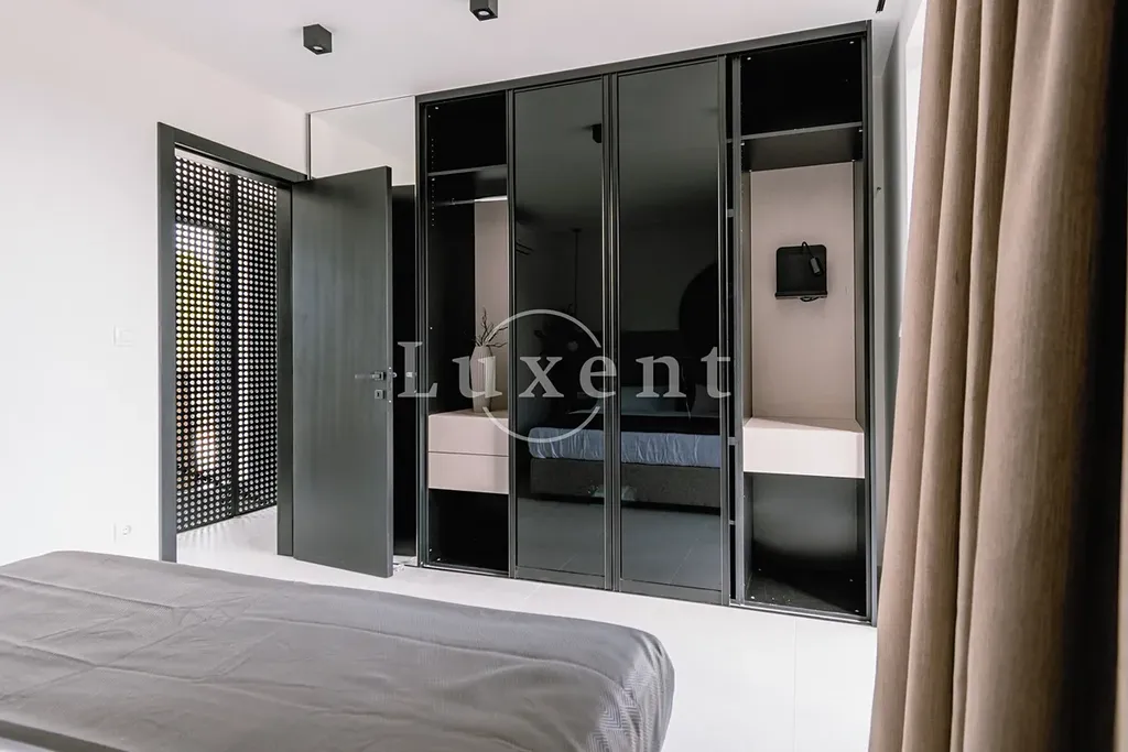 Nemovitost disponuje vybavenou kuchyní, jídelnou a prostorným obývacím pokojem s průchodem na velkou terasu s bazénem. V druhém podlaží jsou čtyři ložnice s balkony a tří koupelny. K vile náleží upravený dvůr s grilem a barem, sauna a parkovací stání na pozemku.