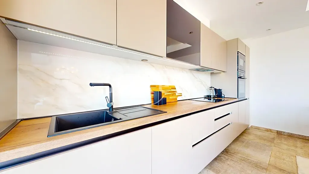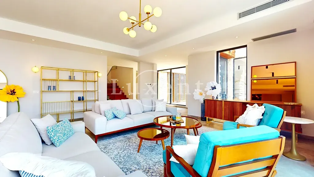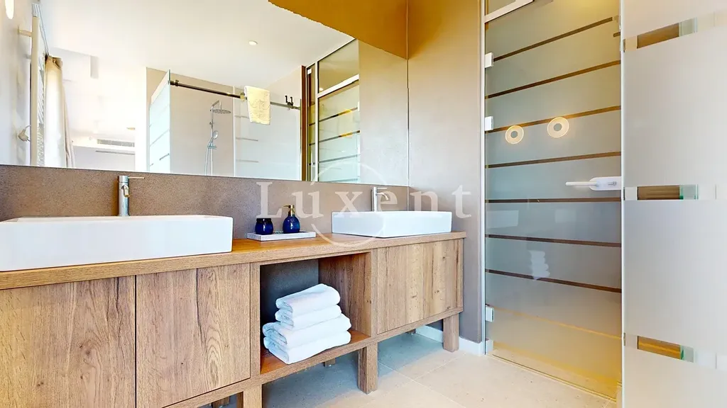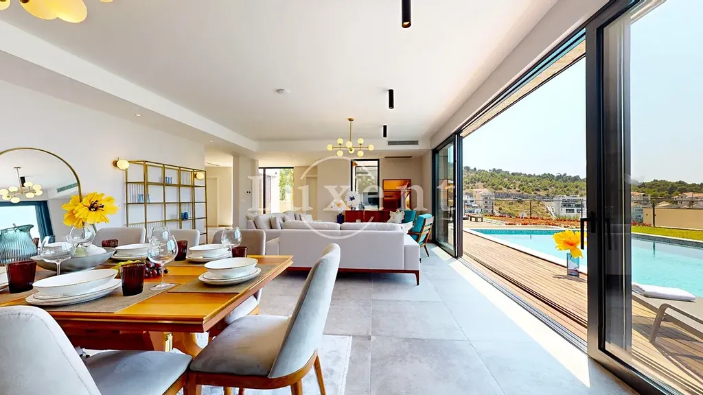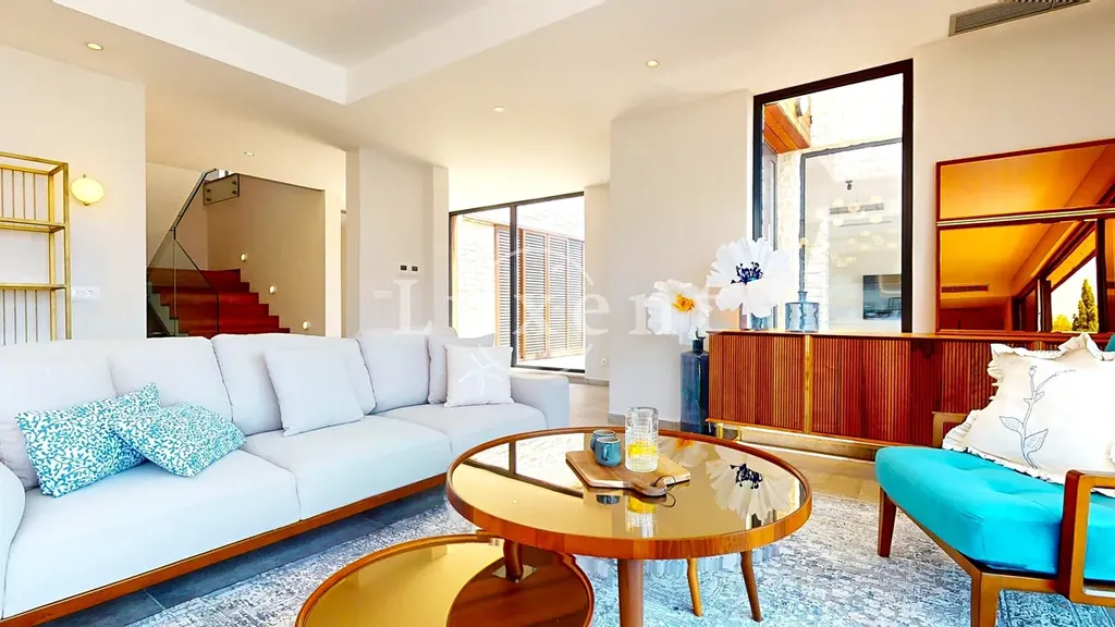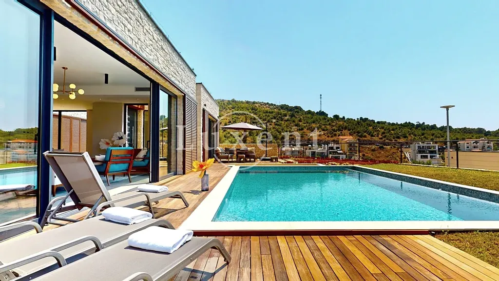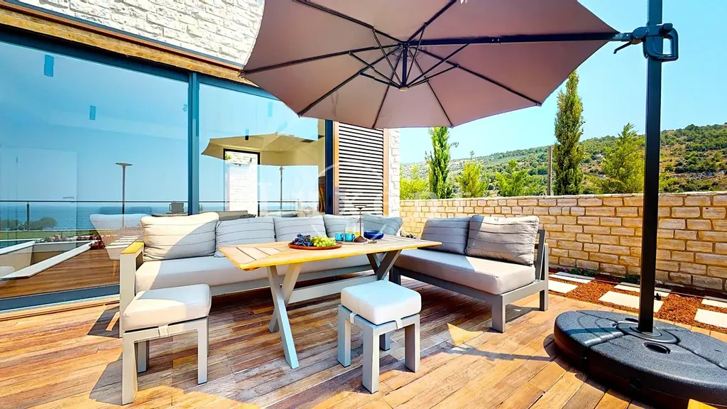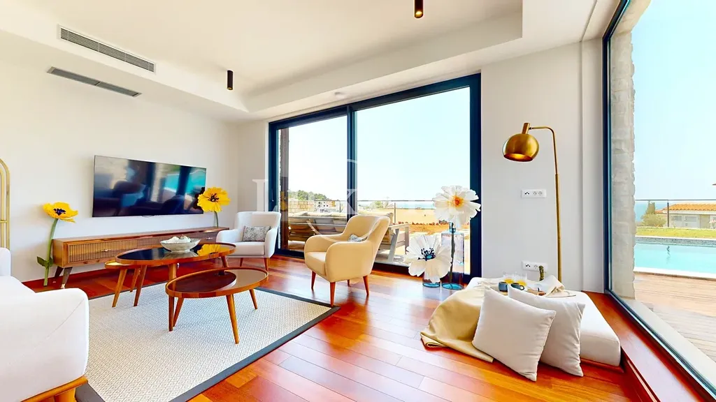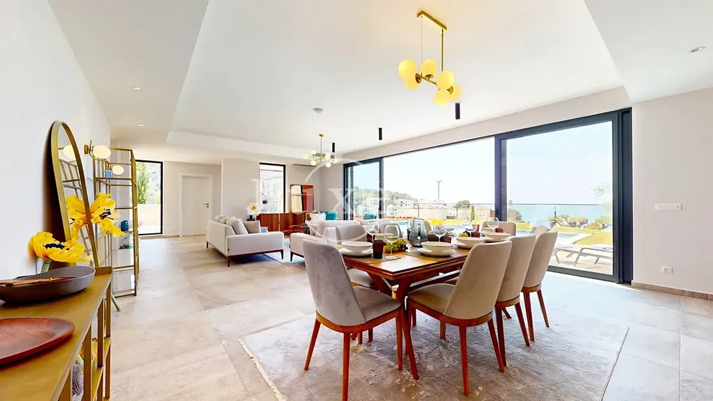 Vila disponuje celkem pěti ložnicemi, šesti koupelnami, prostorným obývacím pokojem propojeným s kuchyní a jídelním koutem. Okna od podlahy až ke stropu maximalizují přístup přirozeného světla a podtrhují výhled na okolní krajinu a moře. Moderní interiérové vybavení, kvalitní materiály a nadčasový design zajišťují příjemnou atmosféru i funkčnost.