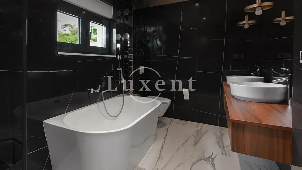 V horním patře se nachází tři komfortní ložnice, z nichž každá má vlastní koupelnu a přímý vstup na balkon s panoramatickým výhledem na moře. Vnitřní schodiště propojuje všechna podlaží a zajišťuje plynulý pohyb po celé vile.