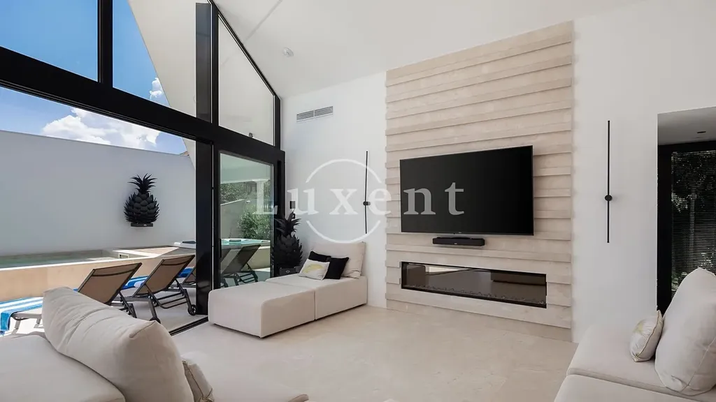 Velké posuvné skleněné stěny propouštějí dostatek denního světla a vizuálně propojují interiér s venkovní částí domu. Přímý vstup na terasu s bazénem a vířivkou vytváří přirozené spojení mezi vnitřním a venkovním životem a umožňuje maximální využití středomořského klimatu.