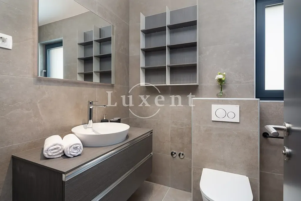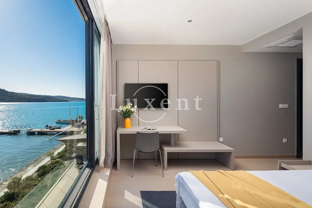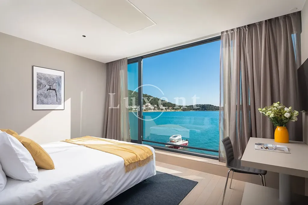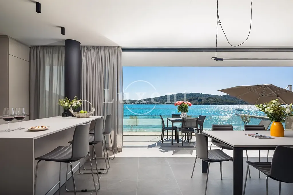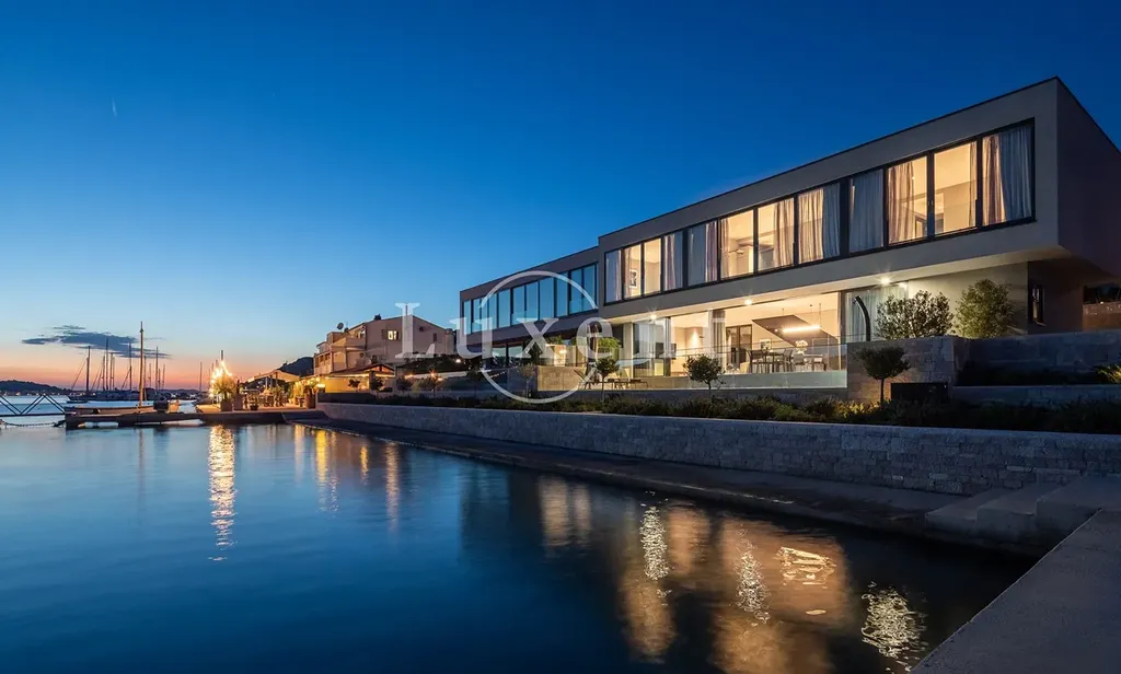 Nabízíme k prodeji novou luxusní vilu situovanou v první řadě u moře, v jedné z nejatraktivnějších destinací pro jachtaře na Jadranu. Tato výjimečná nemovitost se nachází jen pár kroků od upraveného, kameny dlážděného pobřeží, kde má k dispozici vlastní kotviště pro loď. Díky své jižní orientaci a velkoformátovým proskleným stěnám poskytuje vila dechberoucí panoramatické výhledy na moře a okolní ostrovy ze všech obytných místností.