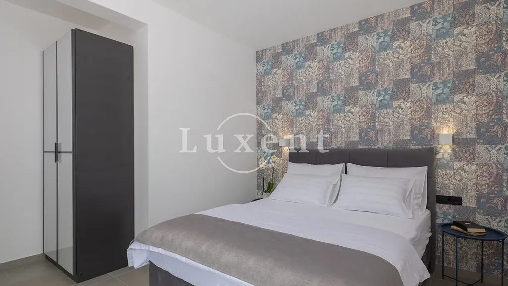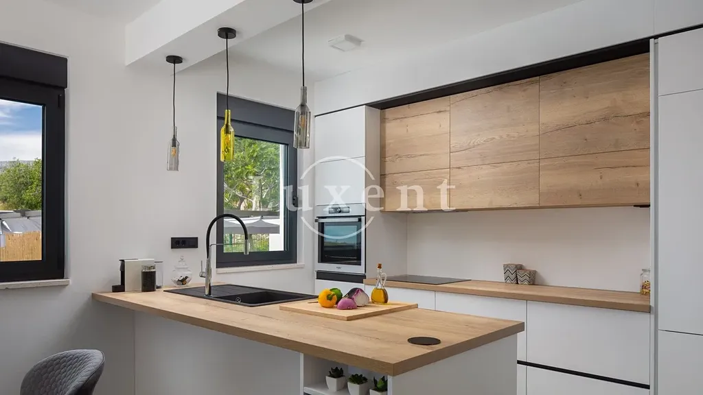 Nabízíme k prodeji jedinečnou vilu situovanou v klidné rezidenční oblasti, která nabízí dokonalou harmonii mezi luxusem, komfortem a soukromím. Nemovitost je obklopena zelení na pozemku o rozloze 710 m2 a disponuje obytnou plochou 130 m2. Díky své poloze nabízí nádherný výhled na moře z většiny místností a venkovních prostor.
