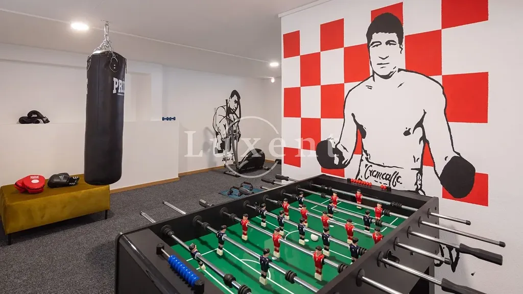Vila se rozkládá na dvou podlažích a suterénu, kde se nachází menší domácí posilovna, herna a technická místnost s bazénovou technologií, která přispívá k pohodlí i funkčnosti domu.