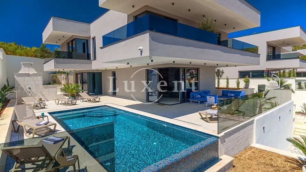 Nabízíme k prodeji zcela novou, elegantně zařízenou vilu s vysokým standardem vybavení, která se nachází jen 150 metrů od moře a krásných pláží, v klidné rybářské vesnici poblíž historického města Trogir zapsaného na seznamu UNESCO.