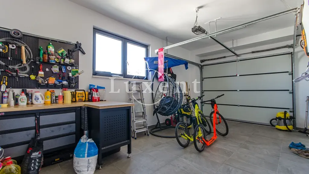 Vila byla dokončena v roce 2022 a nabízí promyšlené dispoziční řešení rozložené do dvou podlaží. Přízemí zahrnuje jednu ložnici s vlastní koupelnou, samostatnou toaletu pro hosty, komoru, technickou místnost a prostorný obytný prostor propojený s kuchyní a jídelnou. Odtud je přímý vstup na terasu s přelivovým a vyhřívaným bazénem, ideálním pro relaxaci s výhledem na moře.