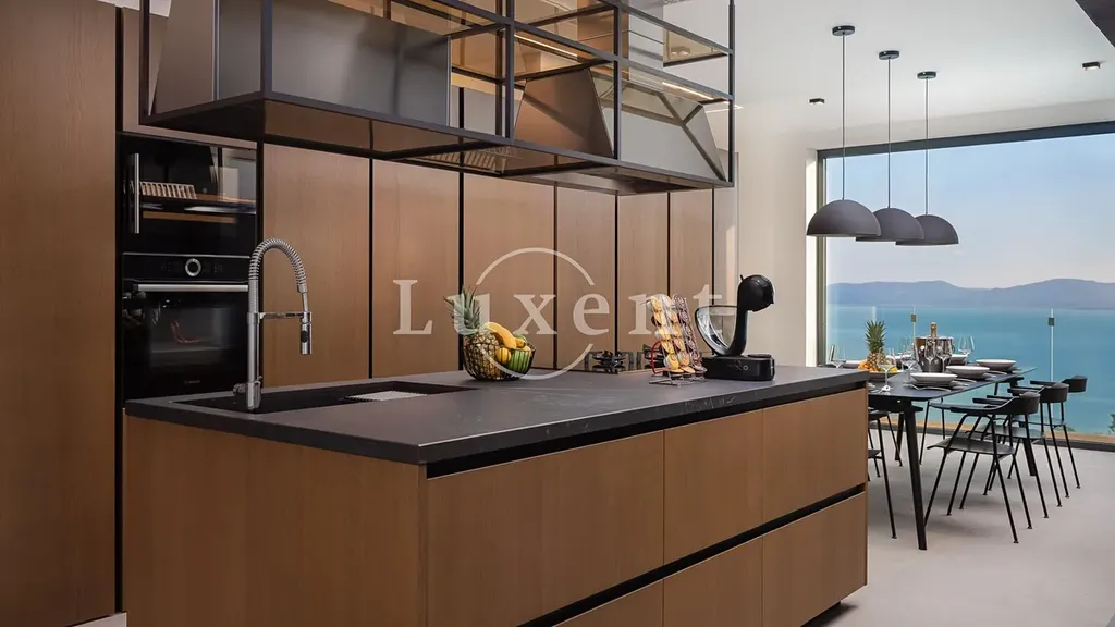 O patro výše se rozprostírá prostorná kuchyně s jídelnou, navržená z nejkvalitnějších materiálů s důrazem na funkčnost a design. Jižní stěna je celoprosklená a otevírá působivý výhled na moře, zatímco severní část obývacího pokoje plynule přechází do venkovního prostoru s terasou, bazénem, venkovní sprchou a slunečními lehátky. Součástí této úrovně jsou i tři ložnice, každá s vlastní koupelnou a soukromou terasou.