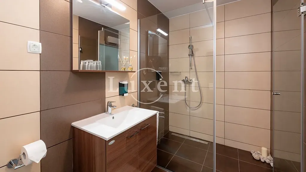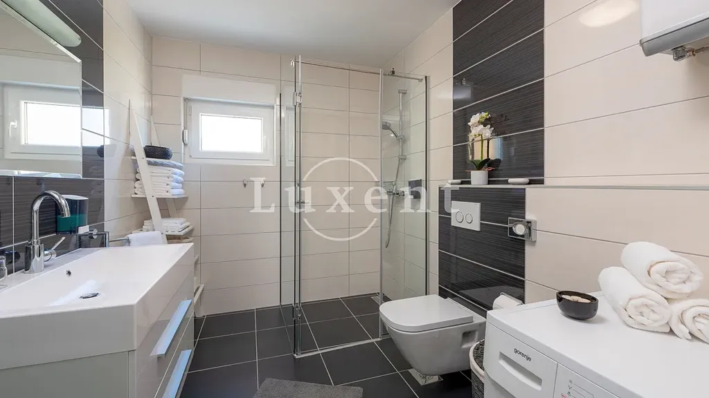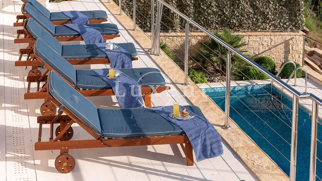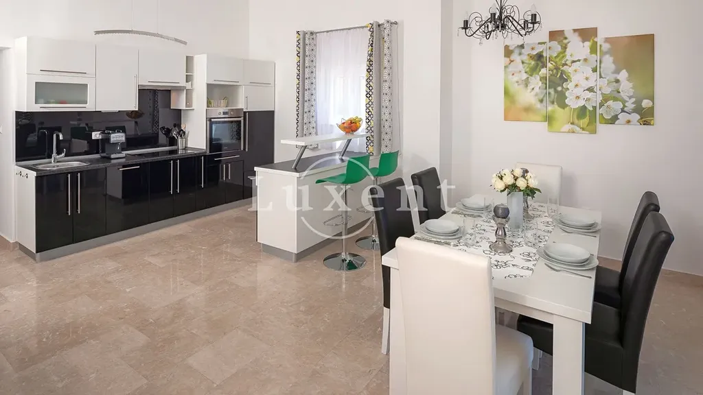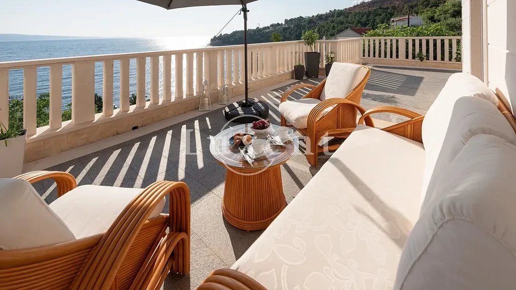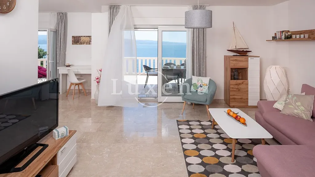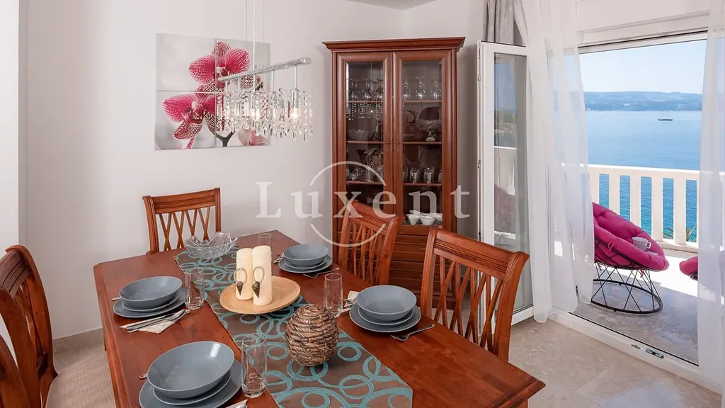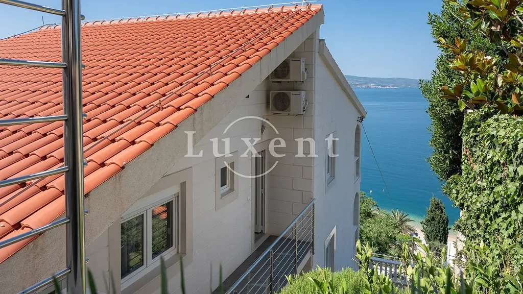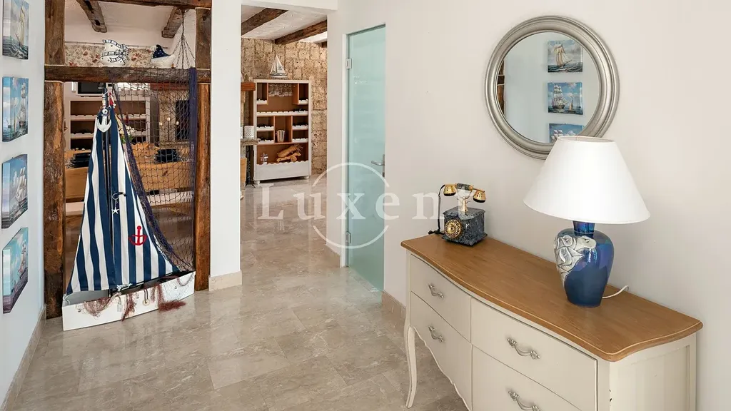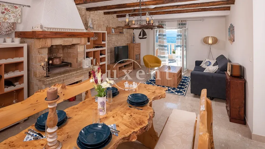 V přízemí se nachází jednopokojový apartmán, jehož součástí je stylově zařízená taverna s vnitřním komínem, ideální pro relaxaci a příjemné večery s rodinou a přáteli. První a druhé patro tvoří identické dvoupokojové apartmány, každý s koupelnou, toaletou pro hosty, kuchyní, jídelnou, obývacím pokojem, dvěma ložnicemi a prostornými terasami a balkony. Každý apartmán nabízí nádherný výhled na moře, a to nejen z pokojů, ale také z balkonů a teras, které jsou ideální pro odpočinek. Součástí nemovitosti je bazén, kolem kterého se nachází opalovací plocha, ze které si můžete užívat panoramatického výhledu na moře.