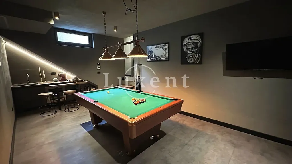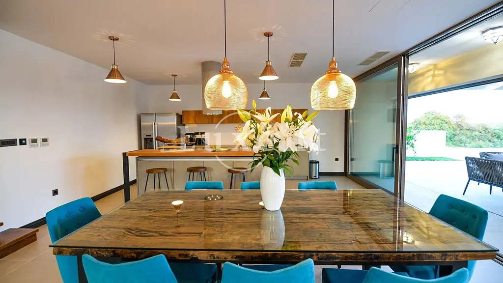 Hlavní obytnou část tvoří elegantní vila s prostorným interiérem, ve kterém se nacházejí tři ložnice, pět koupelen, moderně vybavená posilovna, relaxační sauna a vířivka. Centrem exteriéru je soukromý bazén obklopený sluneční terasou a venkovním krbem – ideální prostor pro odpočinek i společenské chvíle.