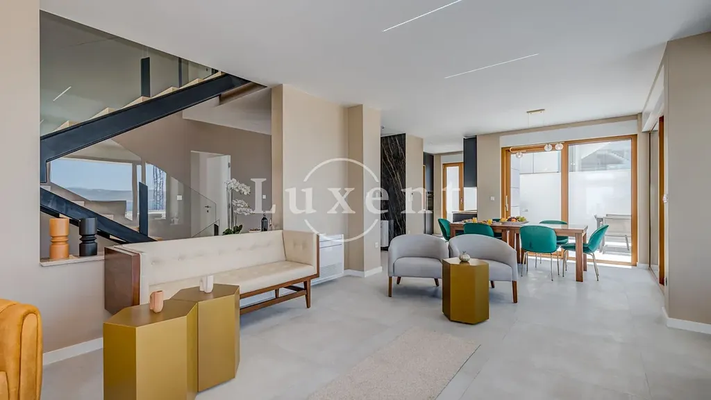Přízemí zahrnuje moderní kuchyň vybavená nejnovějšími spotřebiči, jídelna a prostorný obývací pokoj s přímým vstupem na terasu. Na terase se nachází vyhřívaný venkovní bazén, sluneční terasa a gril s venkovní jídelnou – ideální místo pro společenské chvíle i odpočinek.